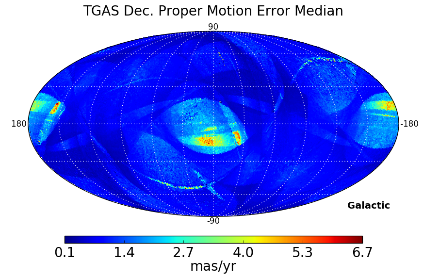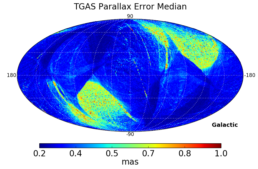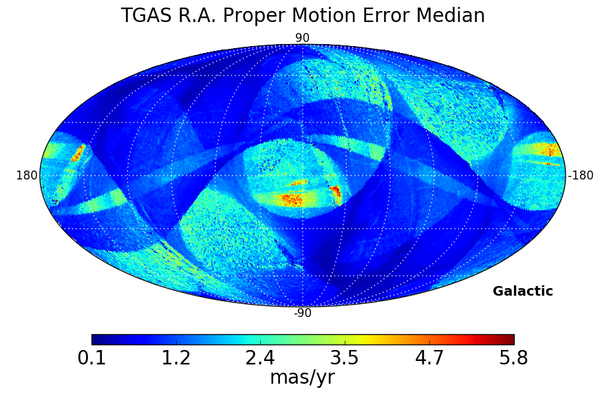 Sky map in galactic coordinates of the standard uncertainties of TGAS: parallaxes (mas, left), proper motions in right ascension ( mas yr-1, centre), and proper motions in declination (right). The precision is, however, much better for the subset of Hipparcos stars.