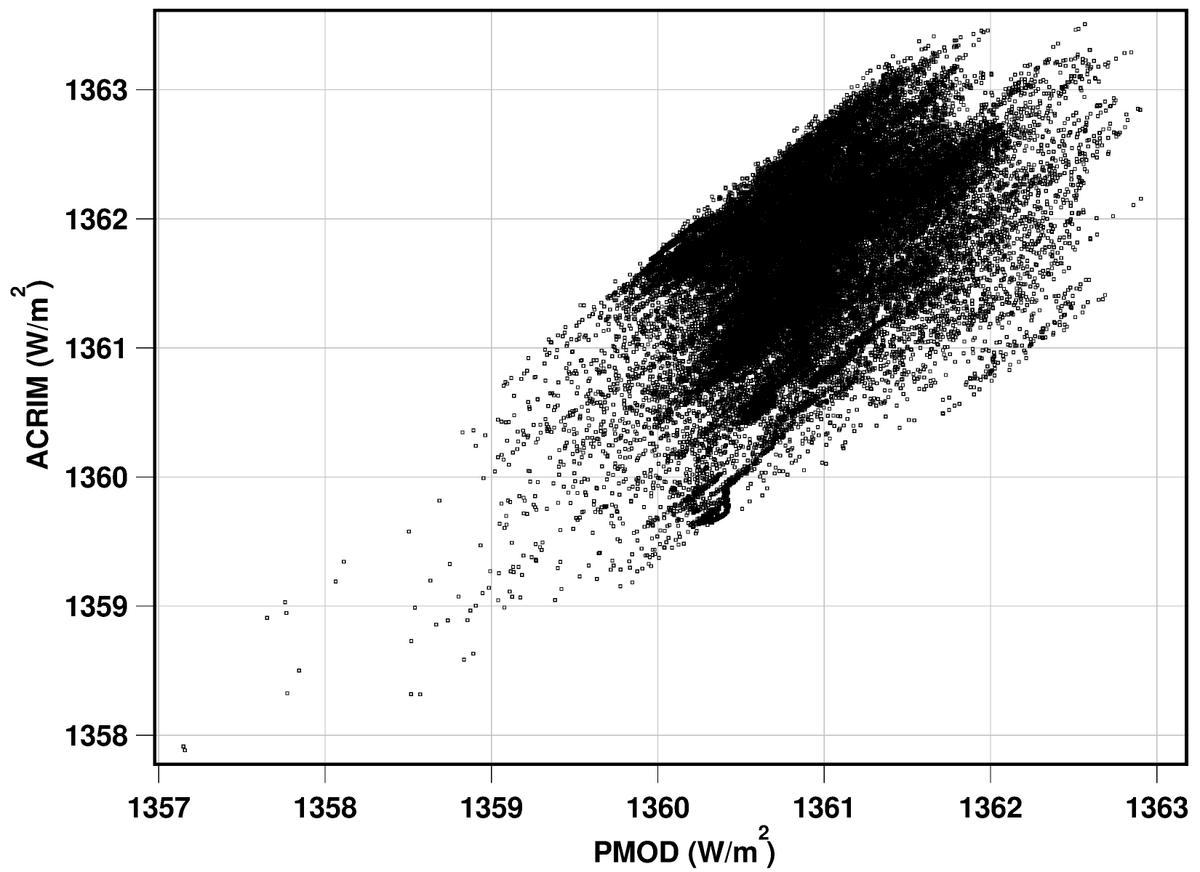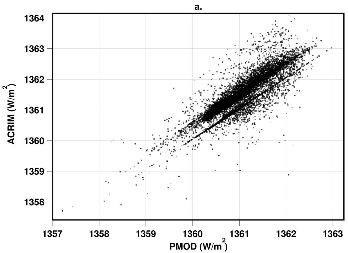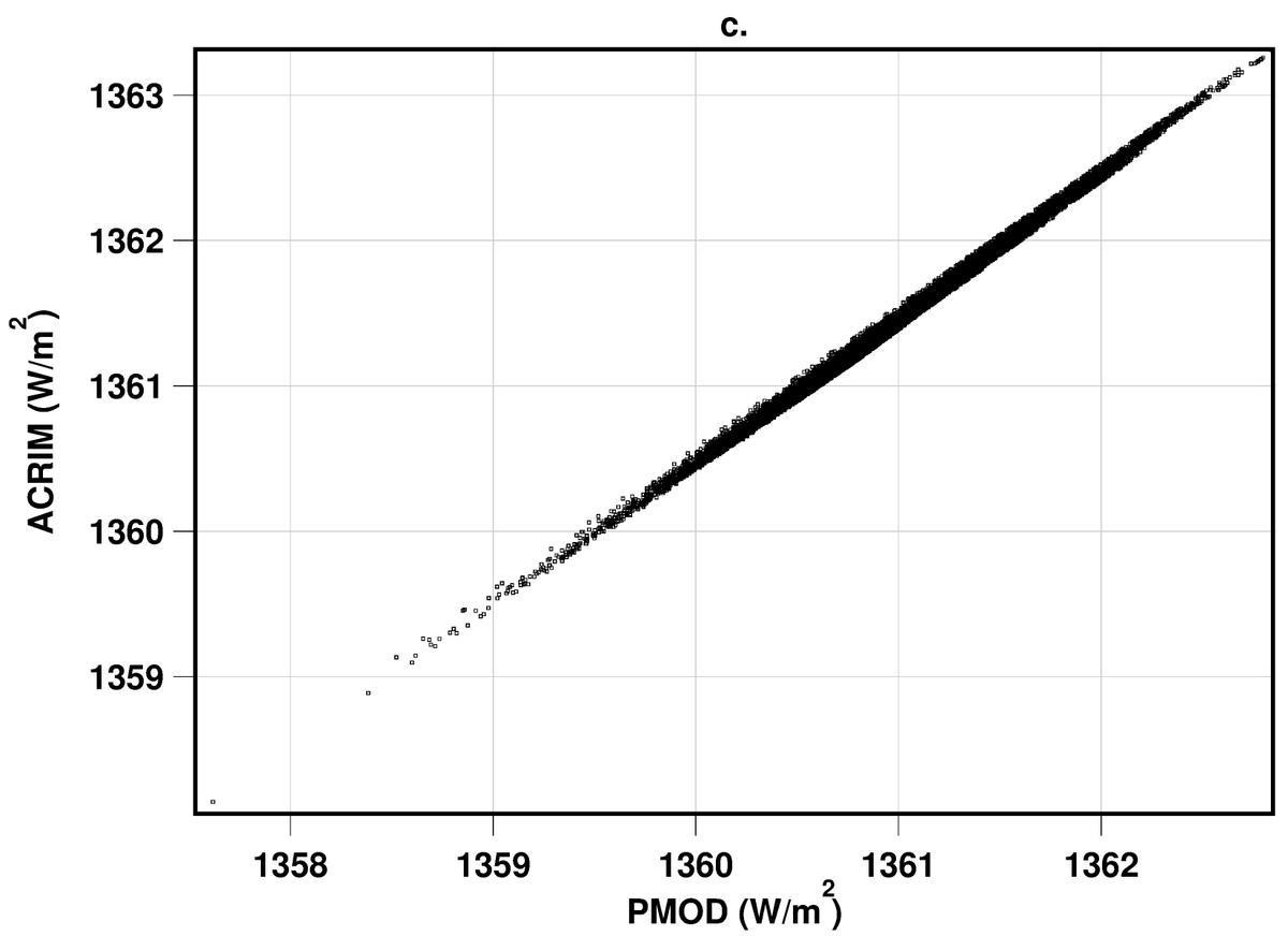 Correlations between PMOD and ACRIM and regression models based on them (using PSI as the proxy): a) cross plot of the original target data sets PMOD vs. ACRIM (Rc = 0.861); b) cross plot for the solution without restrictions (Rc = 0.512, Fig. A.1, see Appendix A.); c) cross plot based on the simplest models (Rc = 0.998); d) cross plot between restricted multicomponent models (Rc = 0.941).