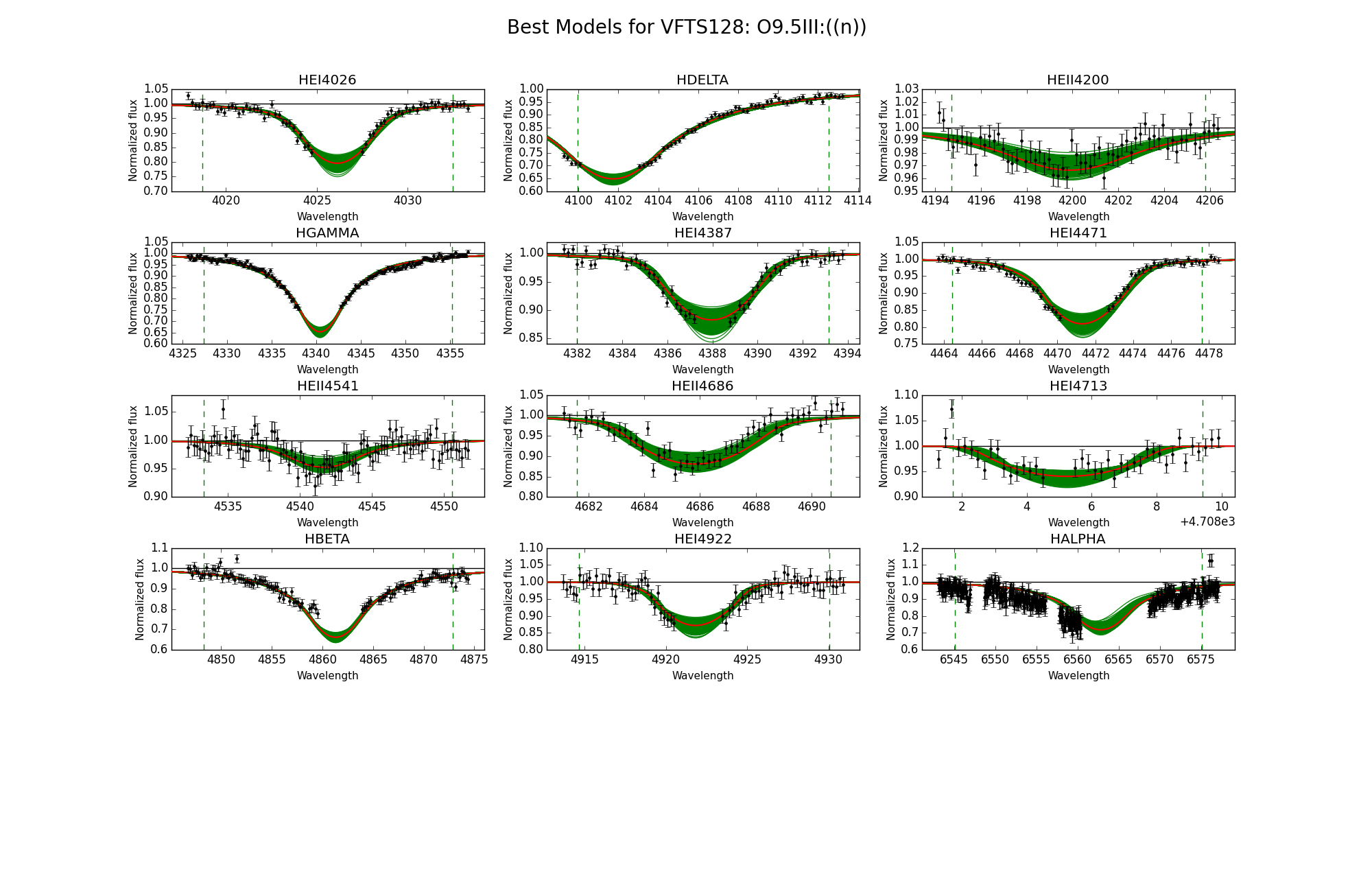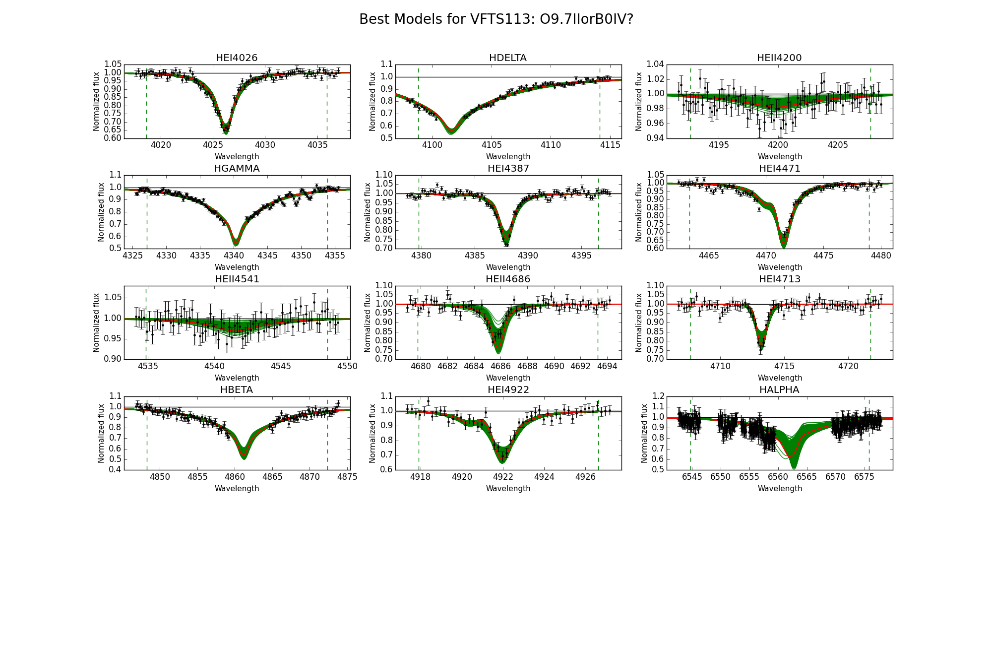 Observed spectra, the 95% probability models (green) and the best fit model (red) for VFTS 113 and 128. The vertical dashed lines indicate the wavelength range used to fit the corresponding diagnostic line.