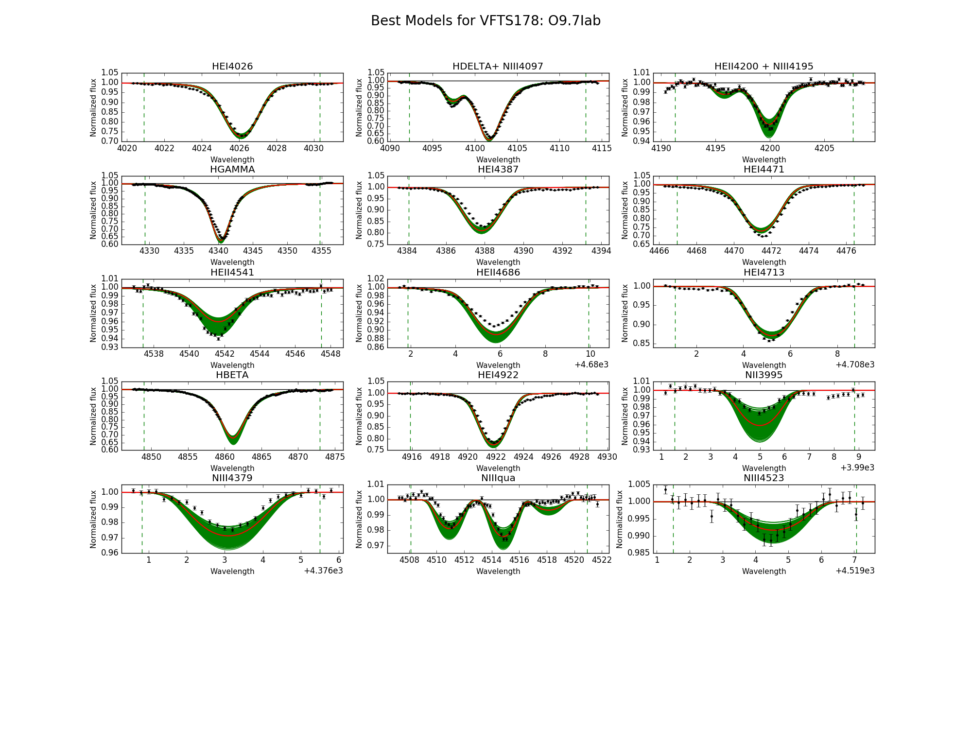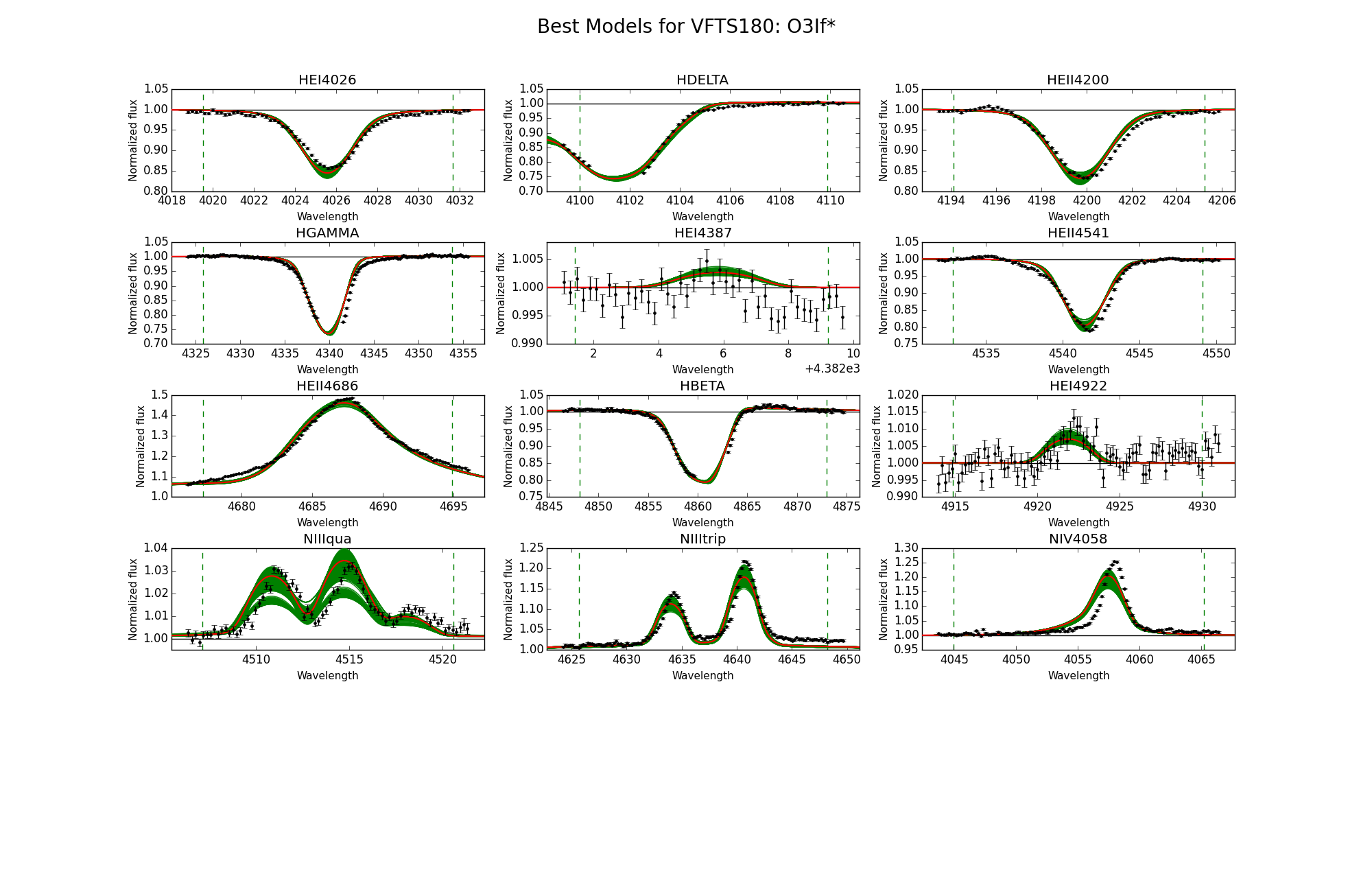 Observed spectra, the 95% probability models (green) and the best fit model (red) for VFTS 178 and 180. The vertical dashed lines indicate the wavelength range used to fit the corresponding diagnostic line.
