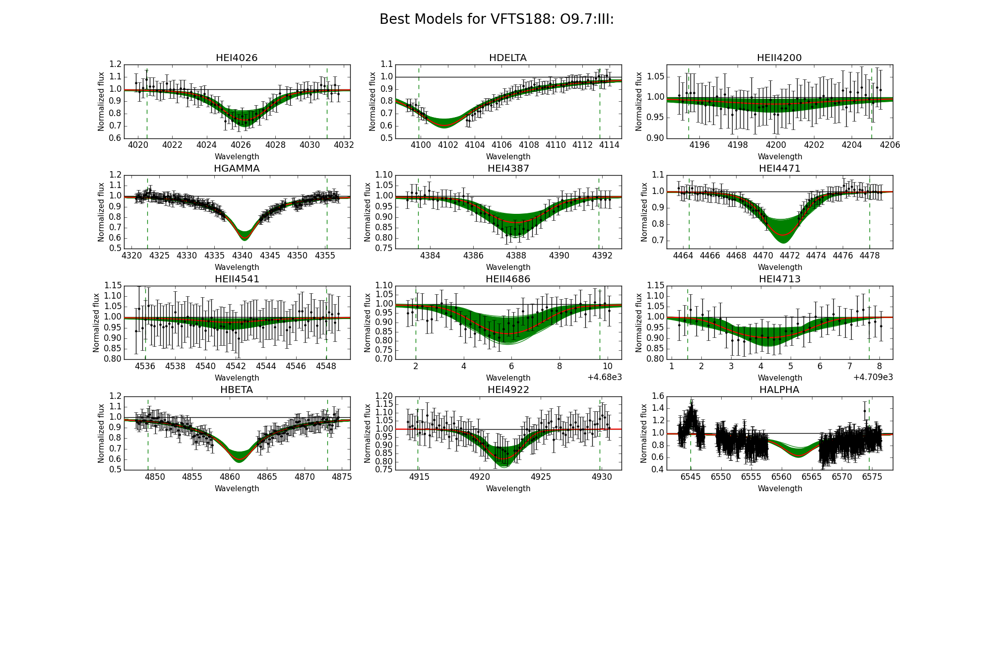 Observed spectra, the 95% probability models (green) and the best fit model (red) for VFTS 185 and 188. The vertical dashed lines indicate the wavelength range used to fit the corresponding diagnostic line.