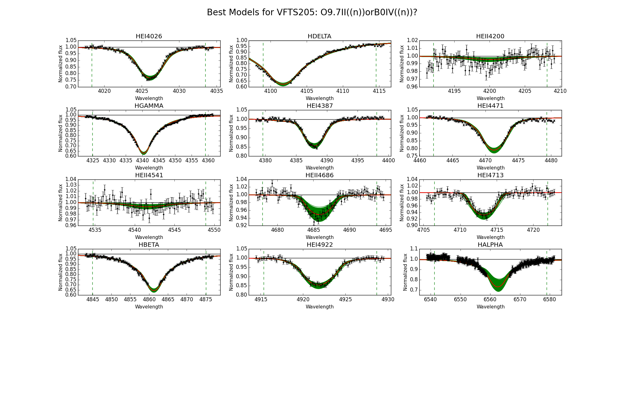 Observed spectra, the 95% probability models (green) and the best fit model (red) for VFTS 192 and 205. The vertical dashed lines indicate the wavelength range used to fit the corresponding diagnostic line.
