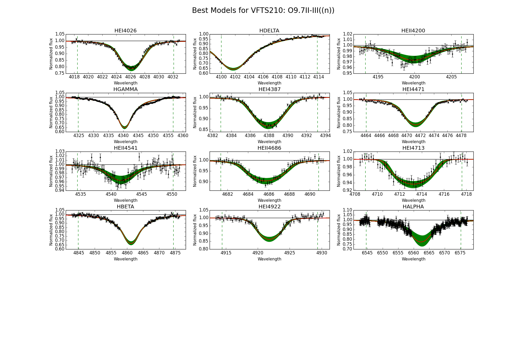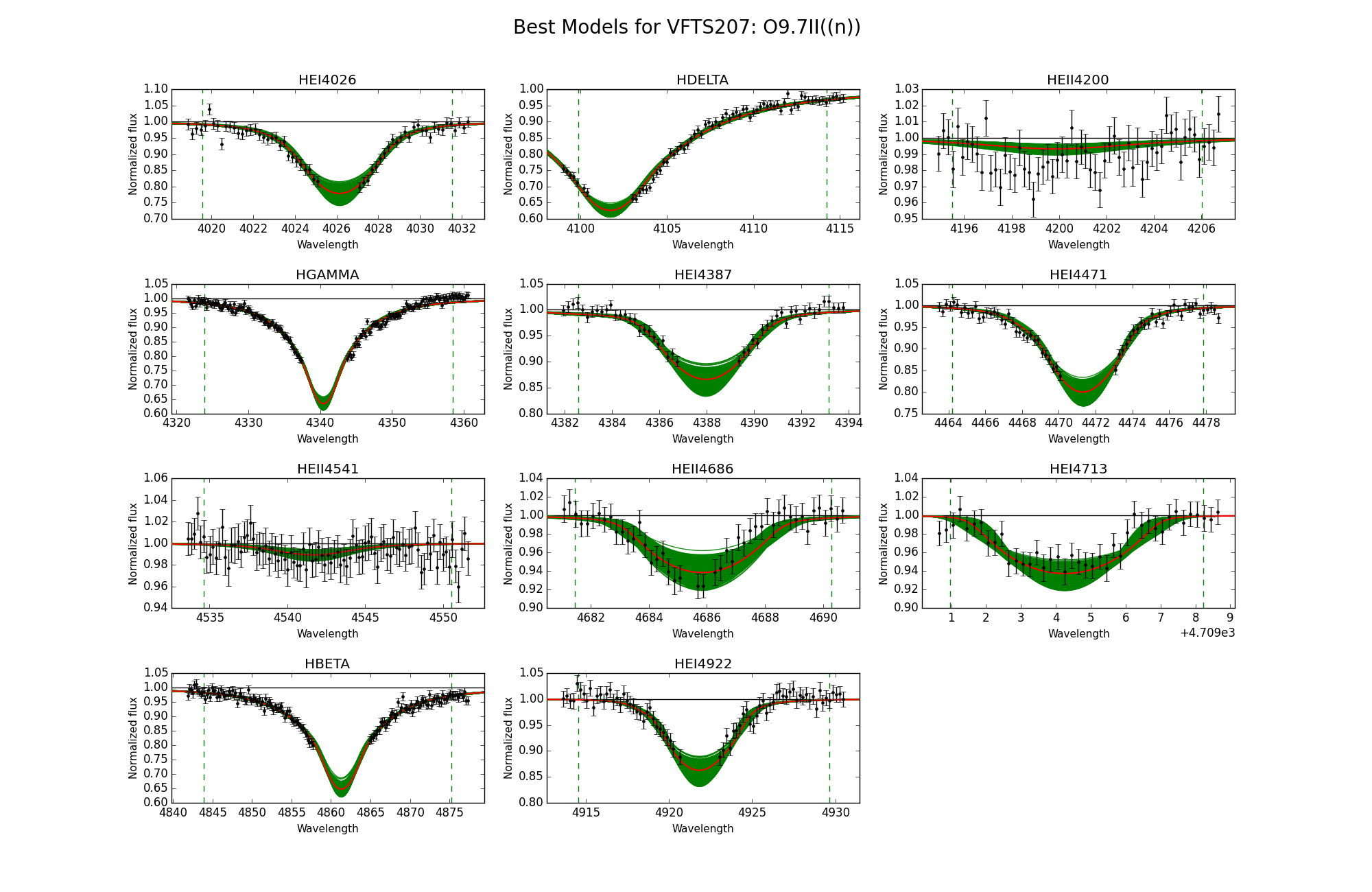Observed spectra, the 95% probability models (green) and the best fit model (red) for VFTS 207 and 210. The vertical dashed lines indicate the wavelength range used to fit the corresponding diagnostic line.