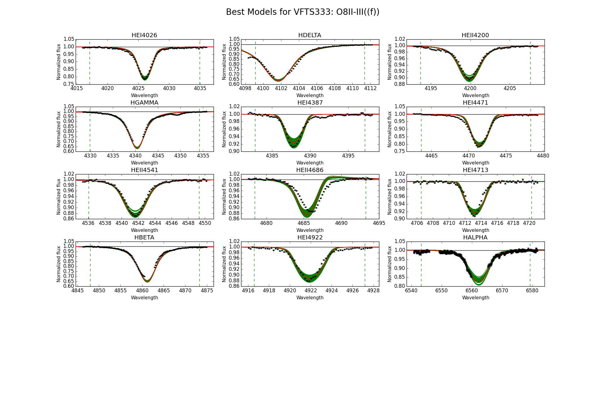 Observed spectra, the 95% probability models (green) and the best fit model (red) for VFTS 333 and 346. The vertical dashed lines indicate the wavelength range used to fit the corresponding diagnostic line.