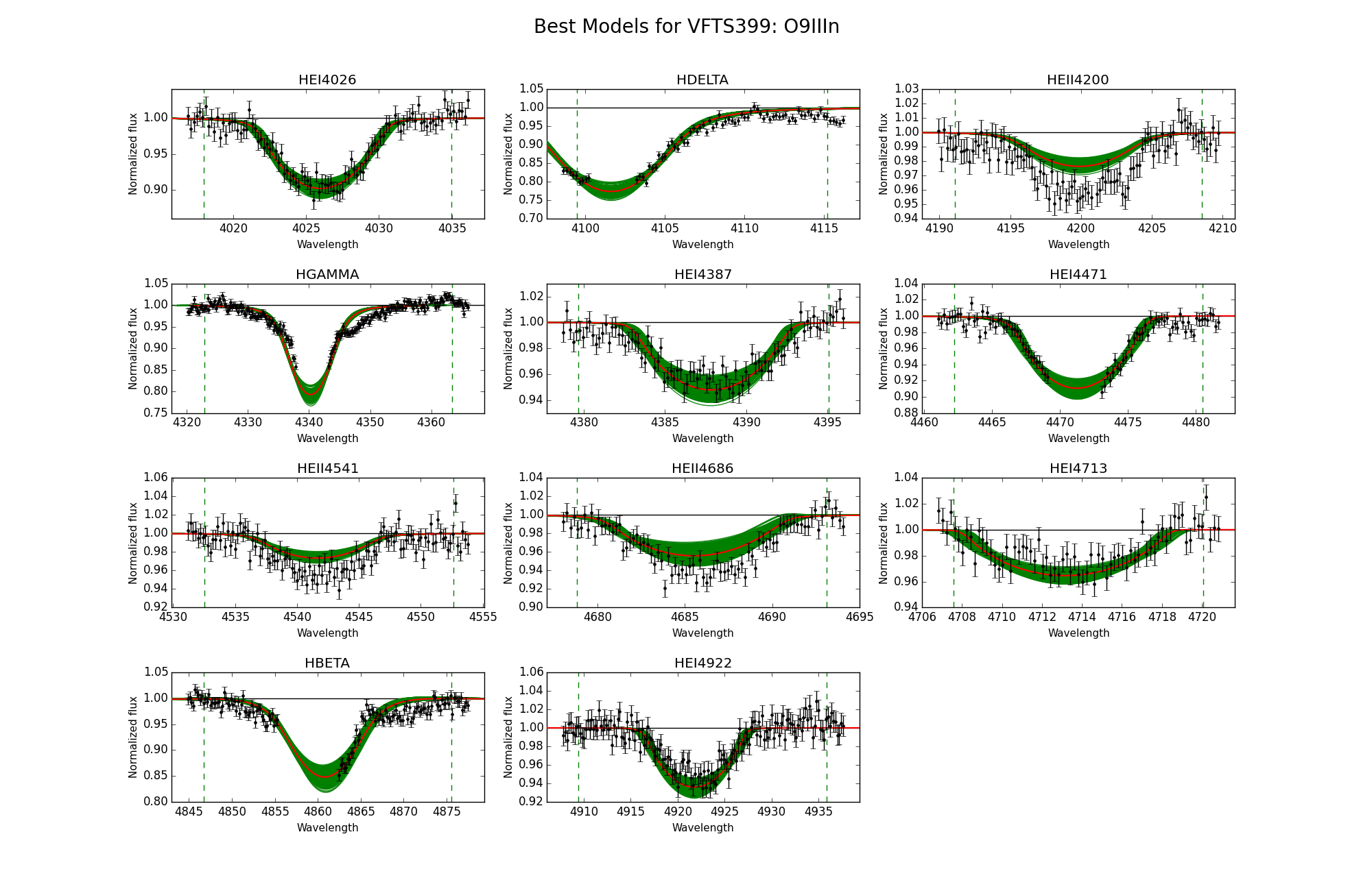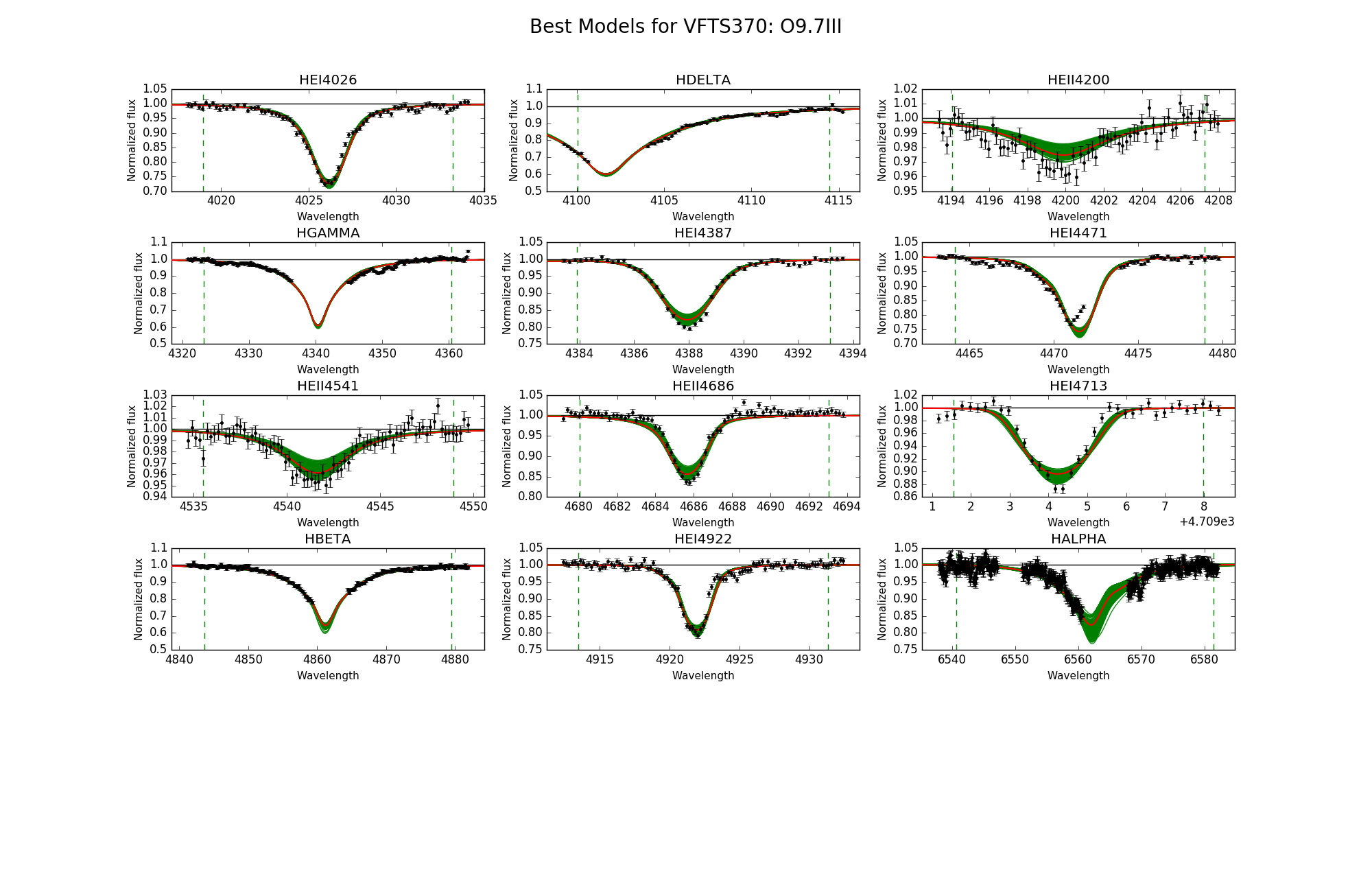 Observed spectra, the 95% probability models (green) and the best fit model (red) for VFTS 370 and 399. The vertical dashed lines indicate the wavelength range used to fit the corresponding diagnostic line.