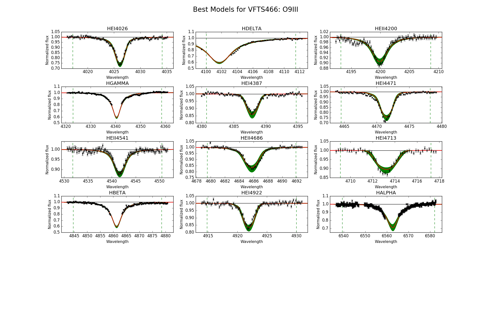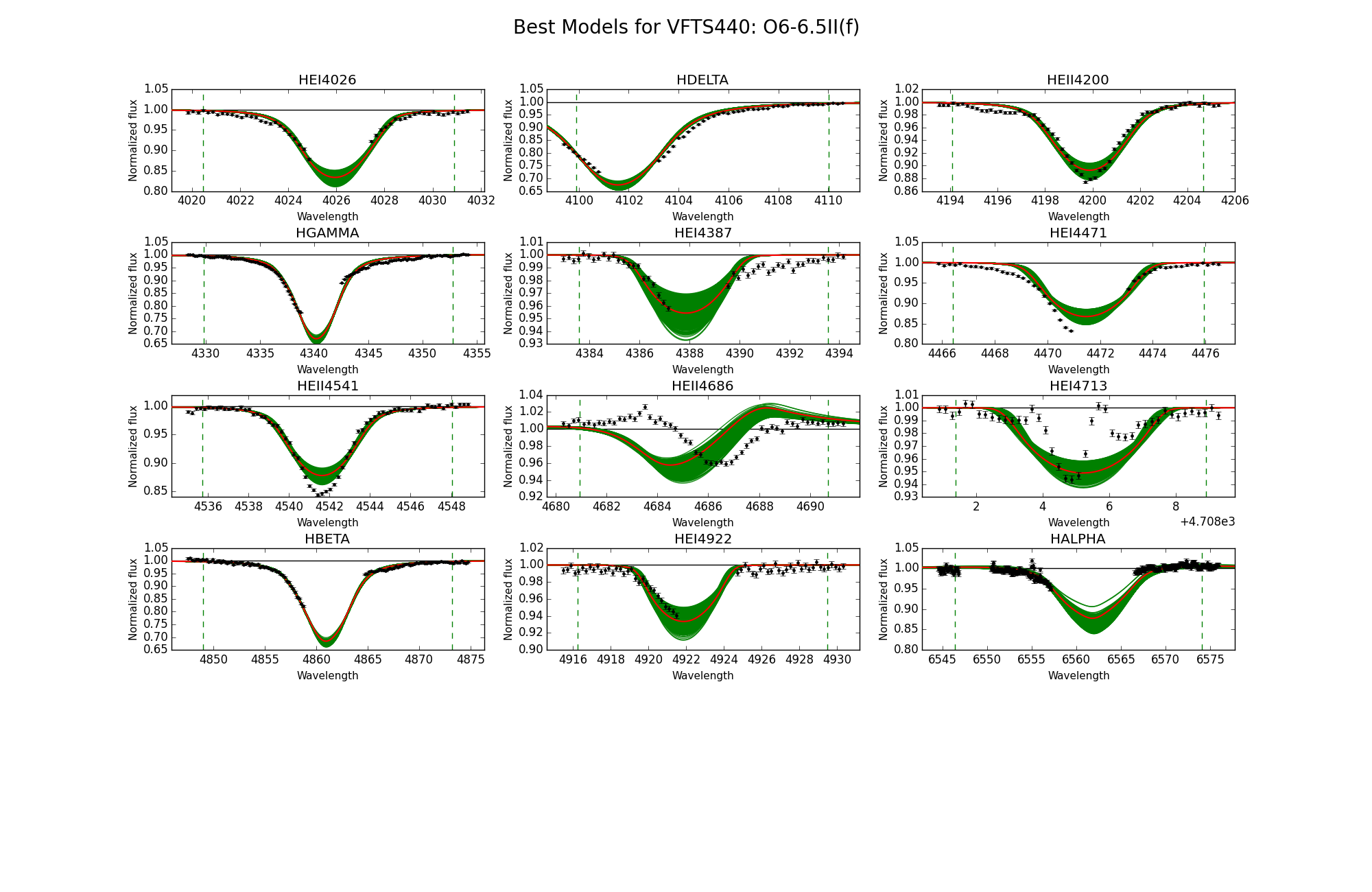 Observed spectra, the 95% probability models (green) and the best fit model (red) for VFTS 440 and 466. The vertical dashed lines indicate the wavelength range used to fit the corresponding diagnostic line.