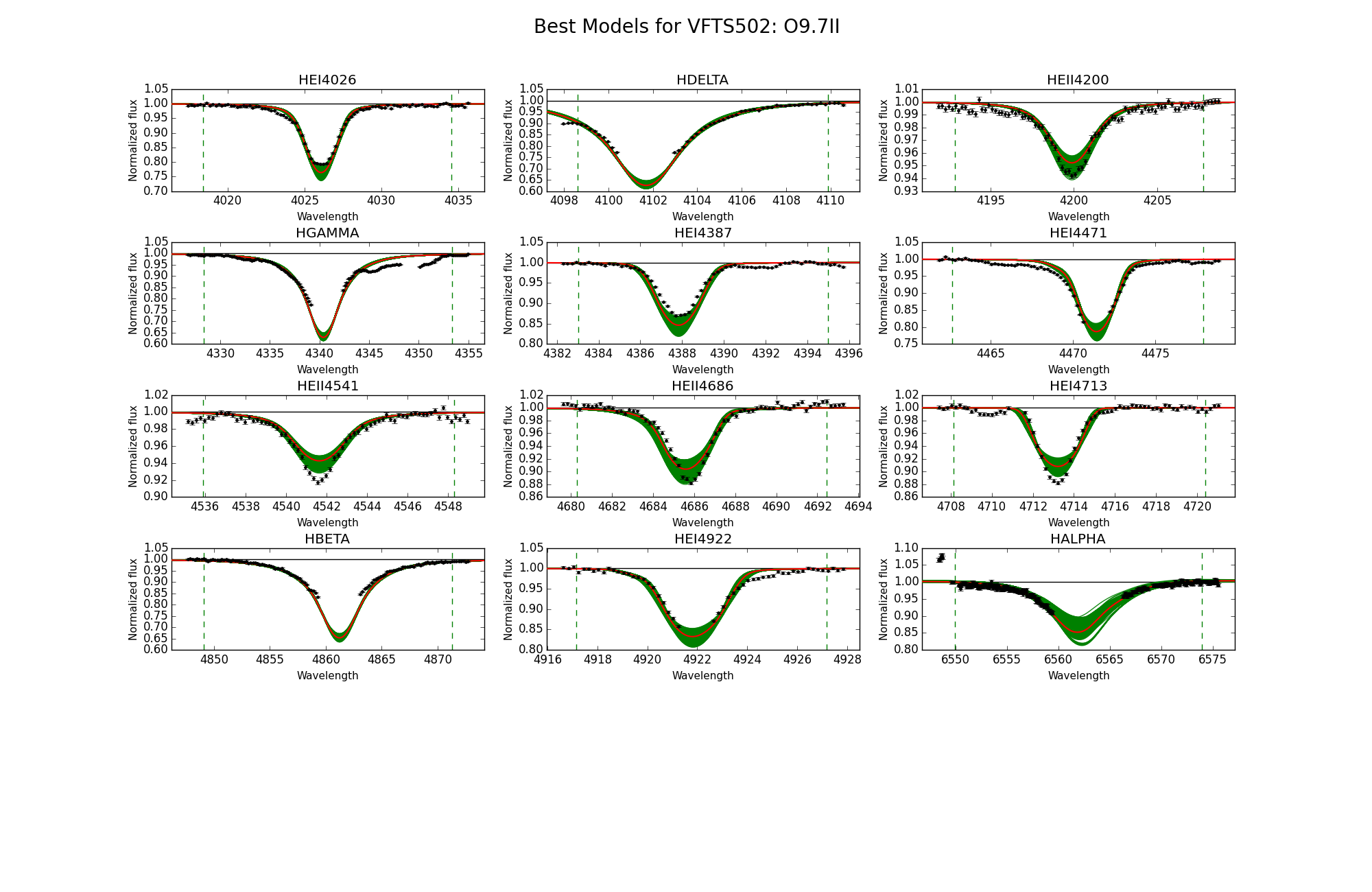 Observed spectra, the 95% probability models (green) and the best fit model (red) for VFTS 495 and 502. The vertical dashed lines indicate the wavelength range used to fit the corresponding diagnostic line.