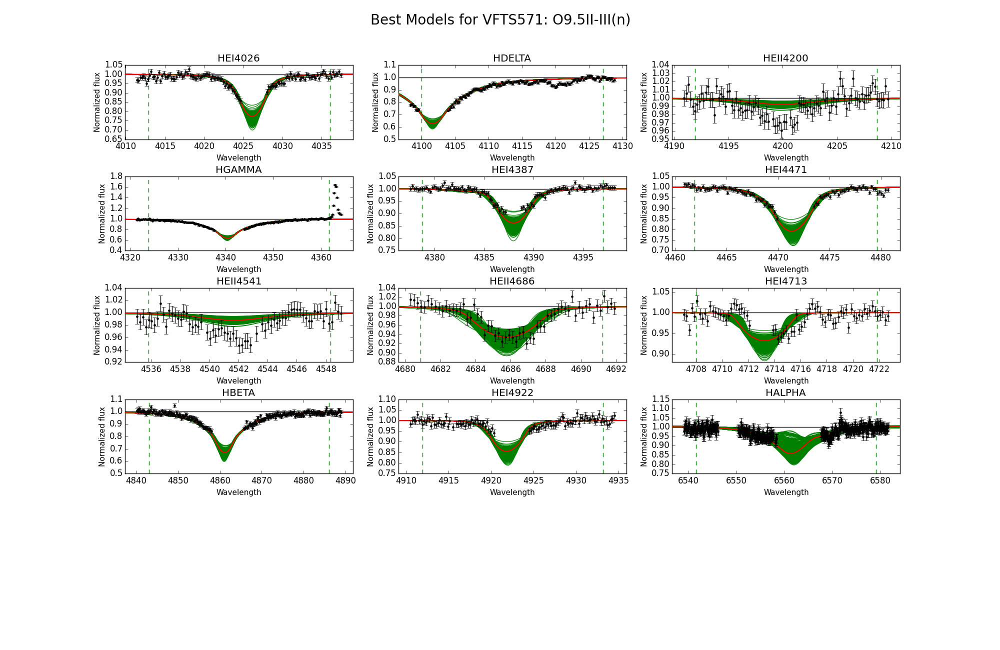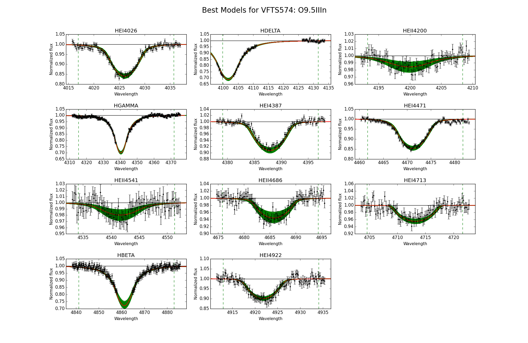 Observed spectra, the 95% probability models (green) and the best fit model (red) for VFTS 571 and 574. The vertical dashed lines indicate the wavelength range used to fit the corresponding diagnostic line.