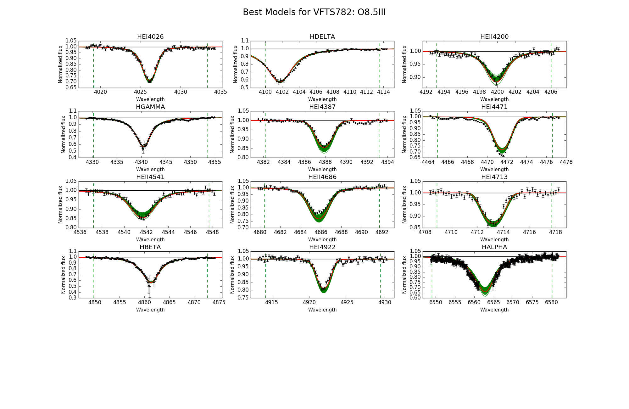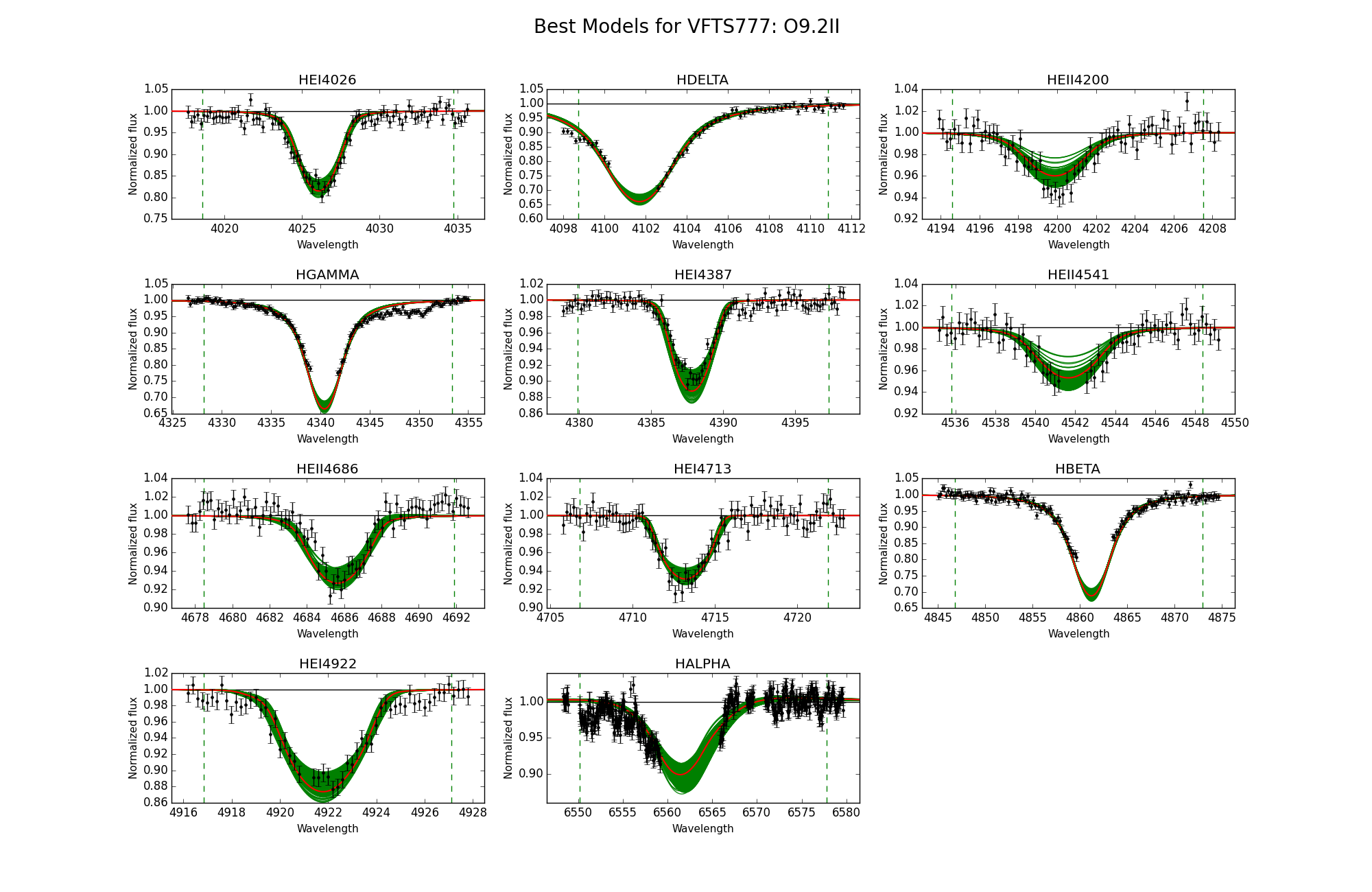 Observed spectra, the 95% probability models (green) and the best fit model (red) for VFTS 777 and 782. The vertical dashed lines indicate the wavelength range used to fit the corresponding diagnostic line.
