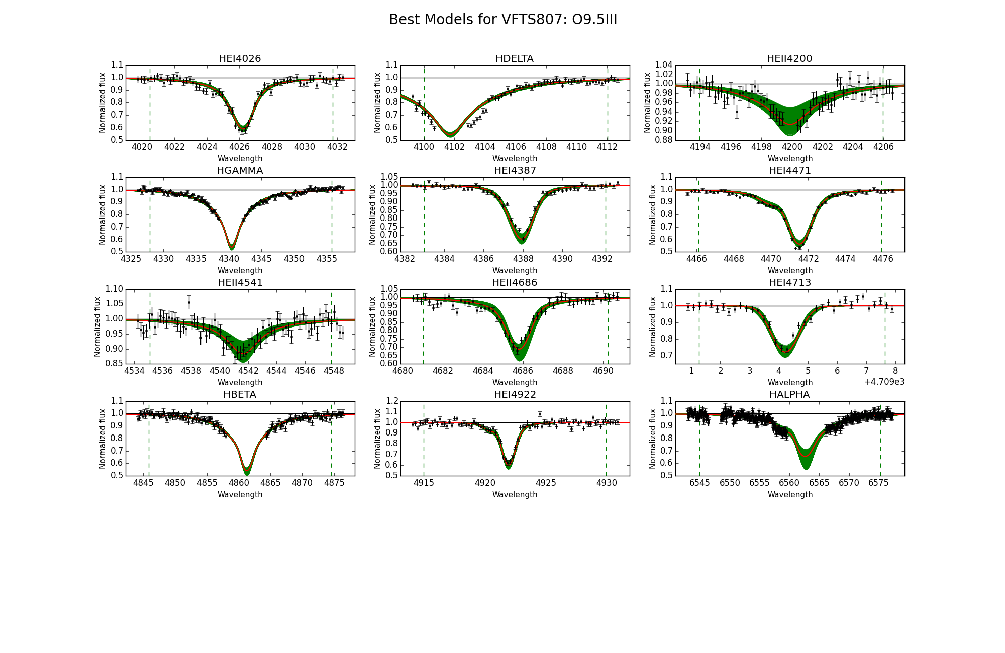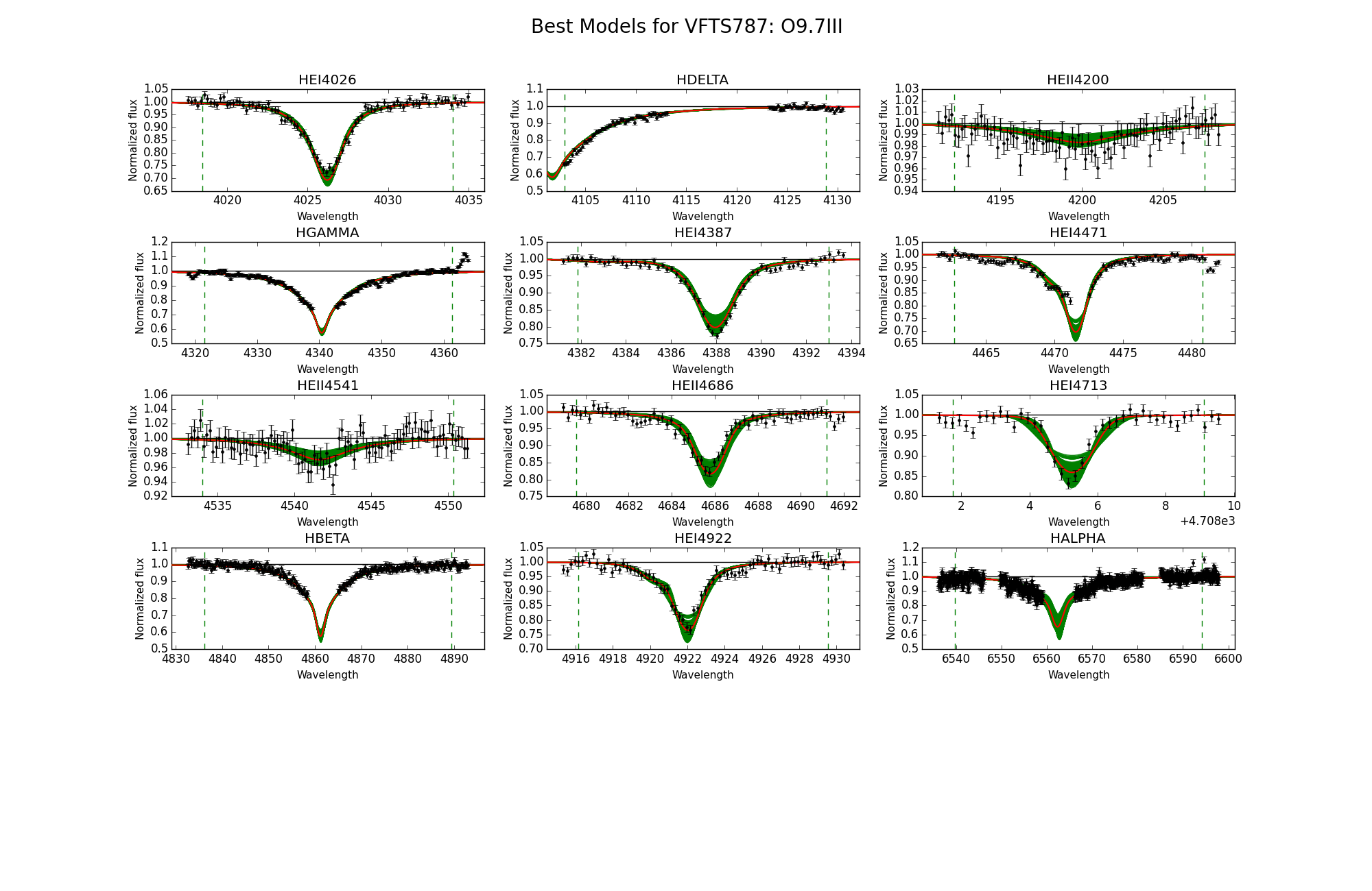 Observed spectra, the 95% probability models (green) and the best fit model (red) for VFTS 787 and 807.