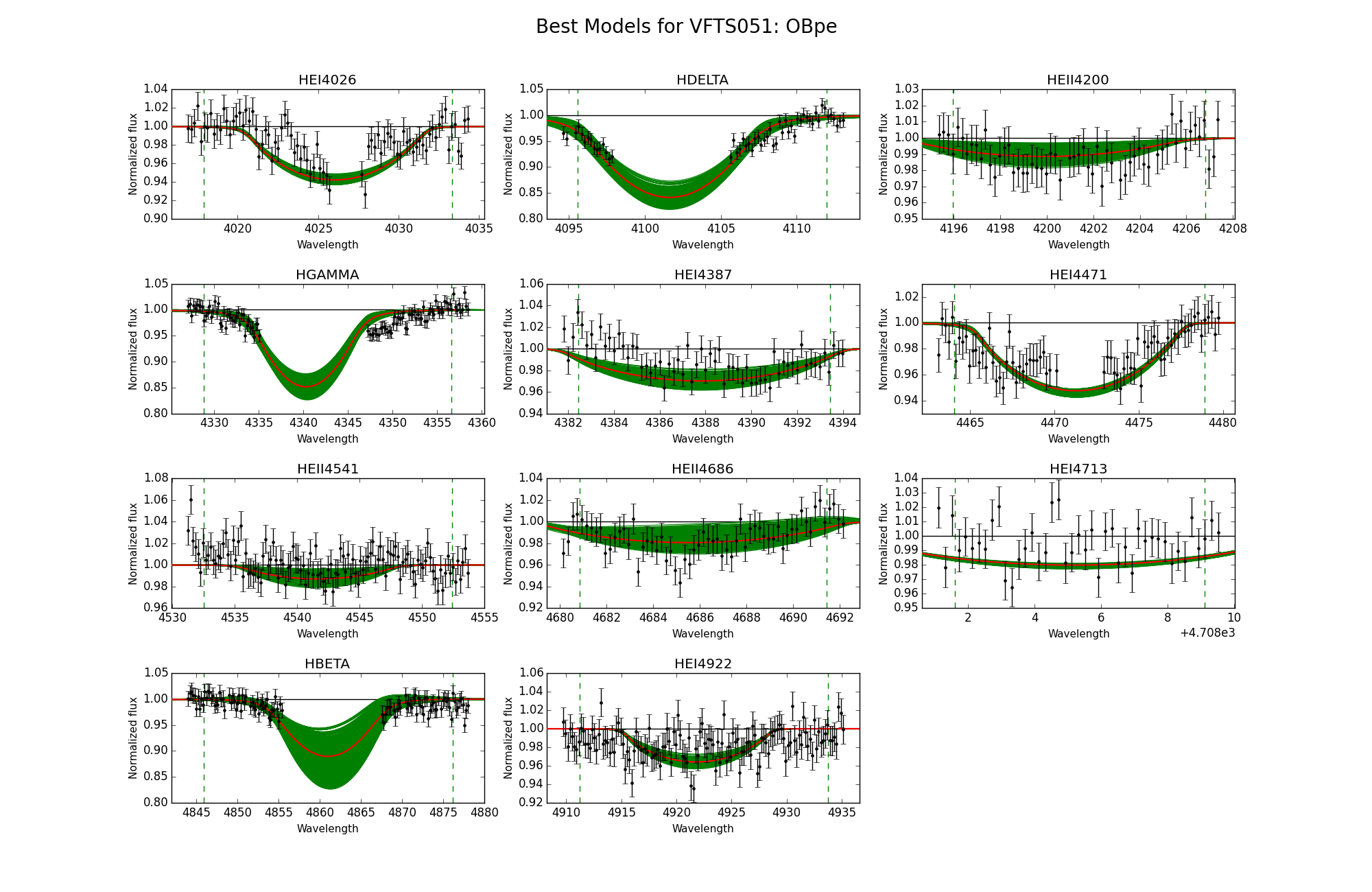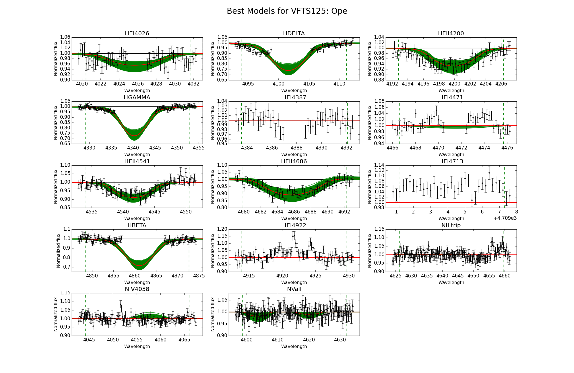 Observed spectra, the 95% probability models (green) and the best fit model (red) for VFTS 051 and 125.