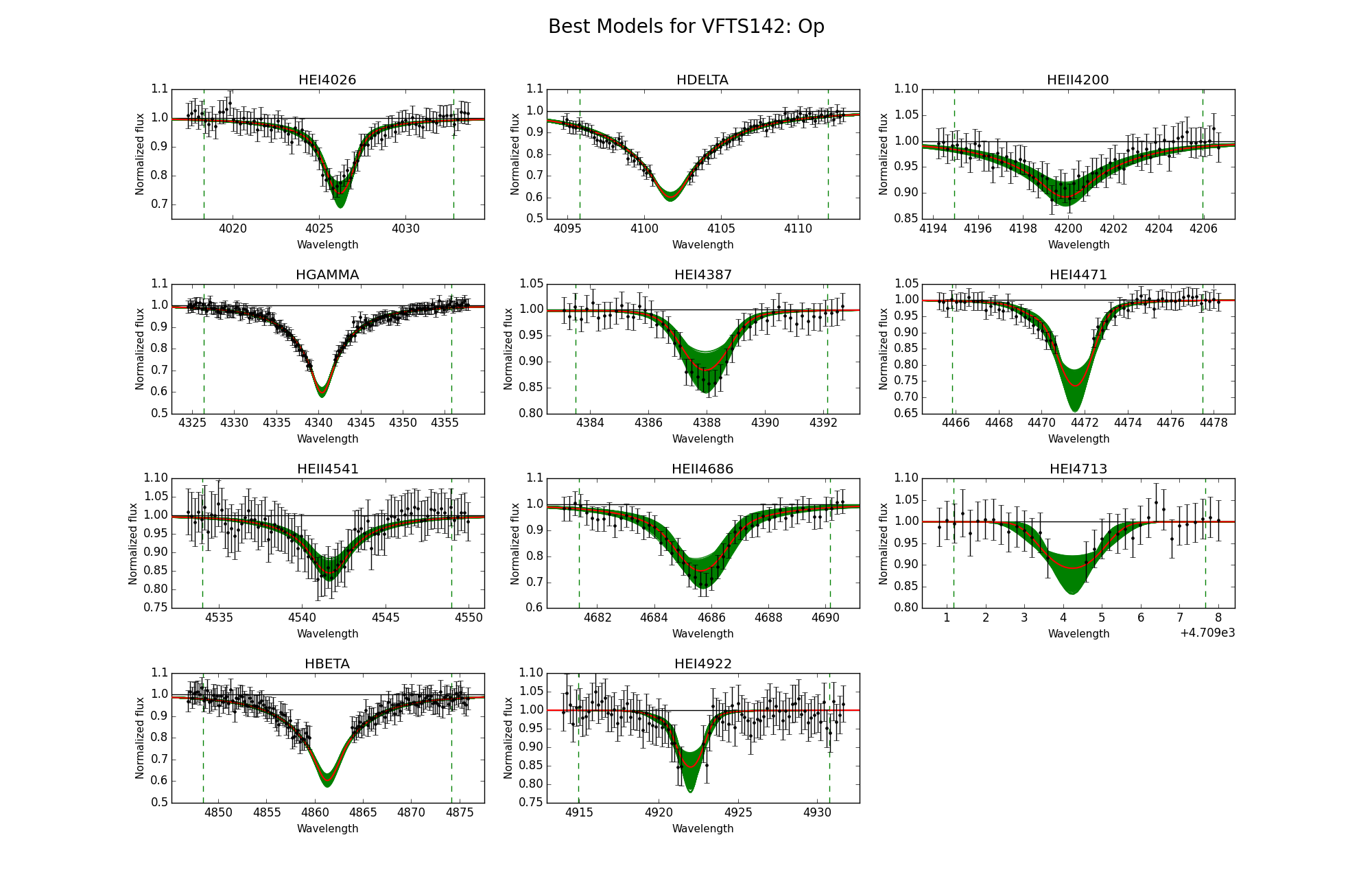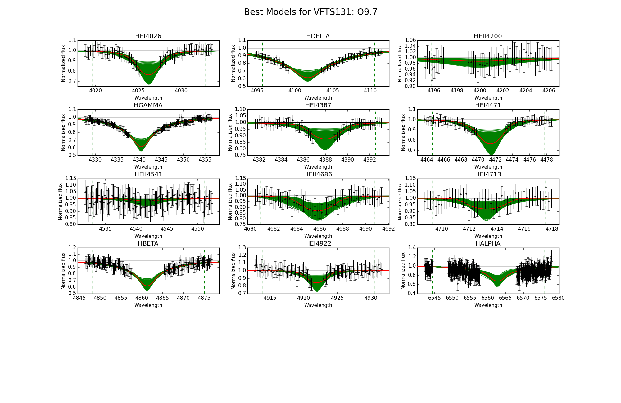 Observed spectra, the 95% probability models (green) and the best fit model (red) for VFTS 131 and 142. The vertical dashed lines indicate the wavelength range used to fit the corresponding diagnostic line.