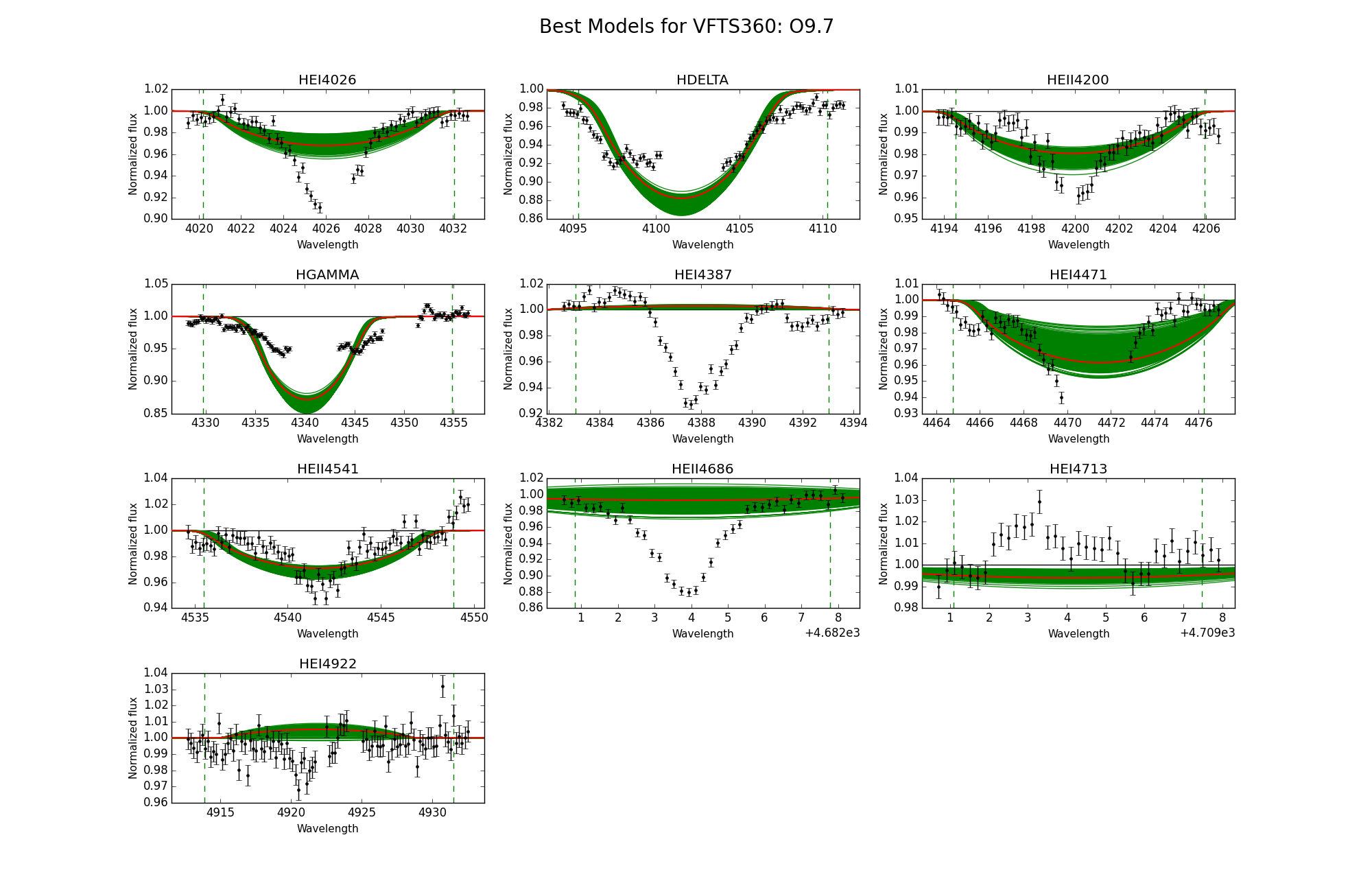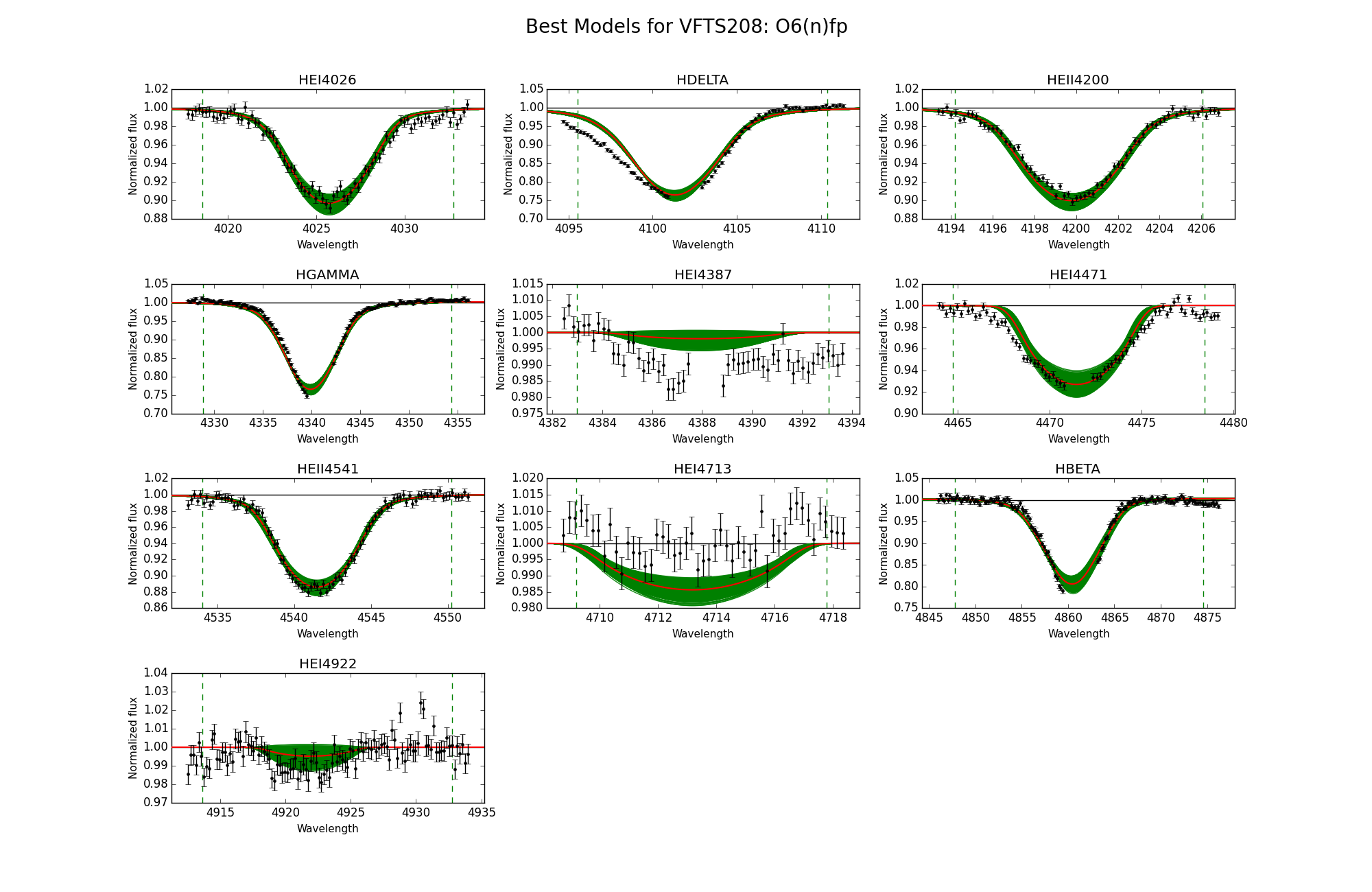Observed spectra, the 95% probability models (green) and the best fit model (red) for VFTS 208 and 360. The vertical dashed lines indicate the wavelength range used to fit the corresponding diagnostic line.