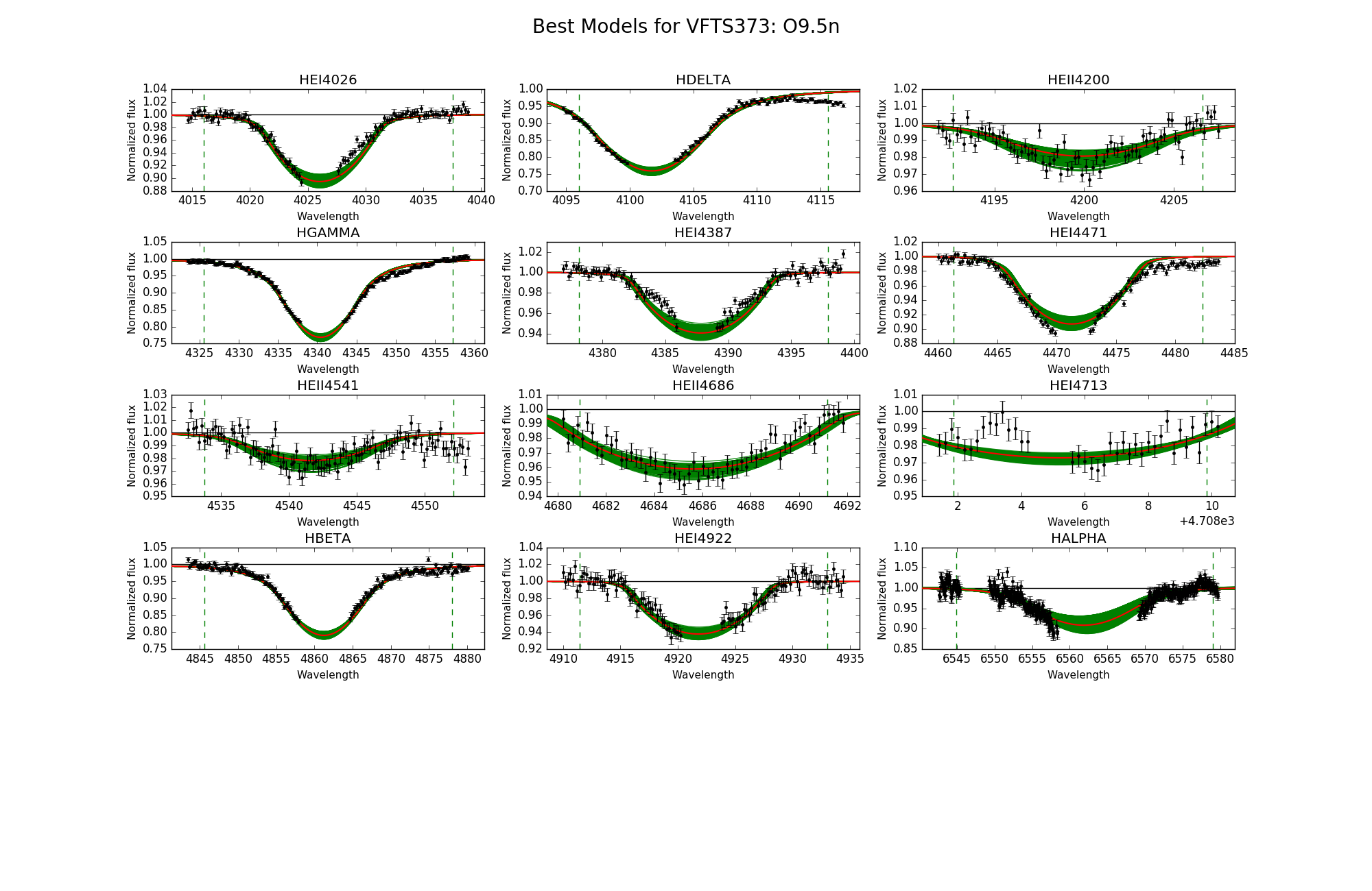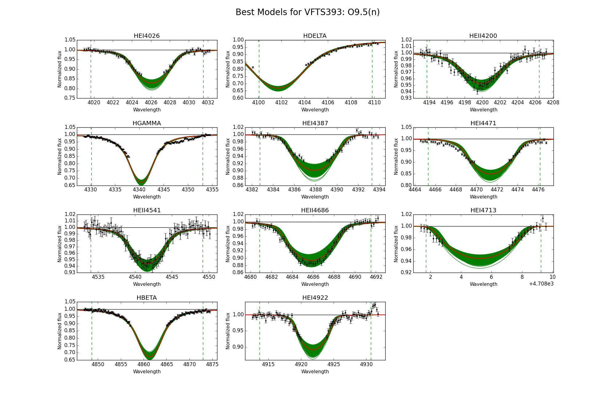 Observed spectra, the 95% probability models (green) and the best fit model (red) for VFTS 373 and 393. The vertical dashed lines indicate the wavelength range used to fit the corresponding diagnostic line.
