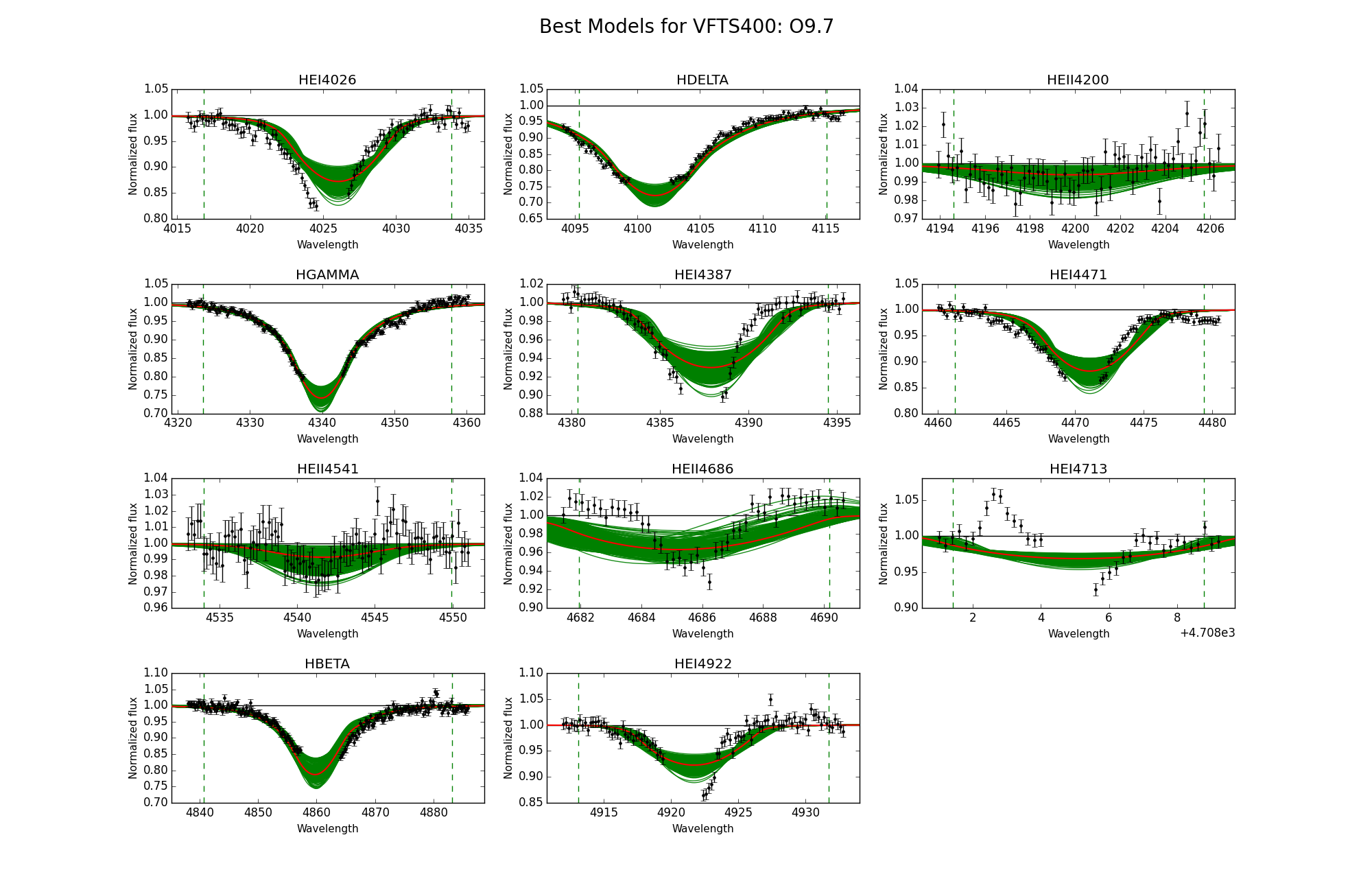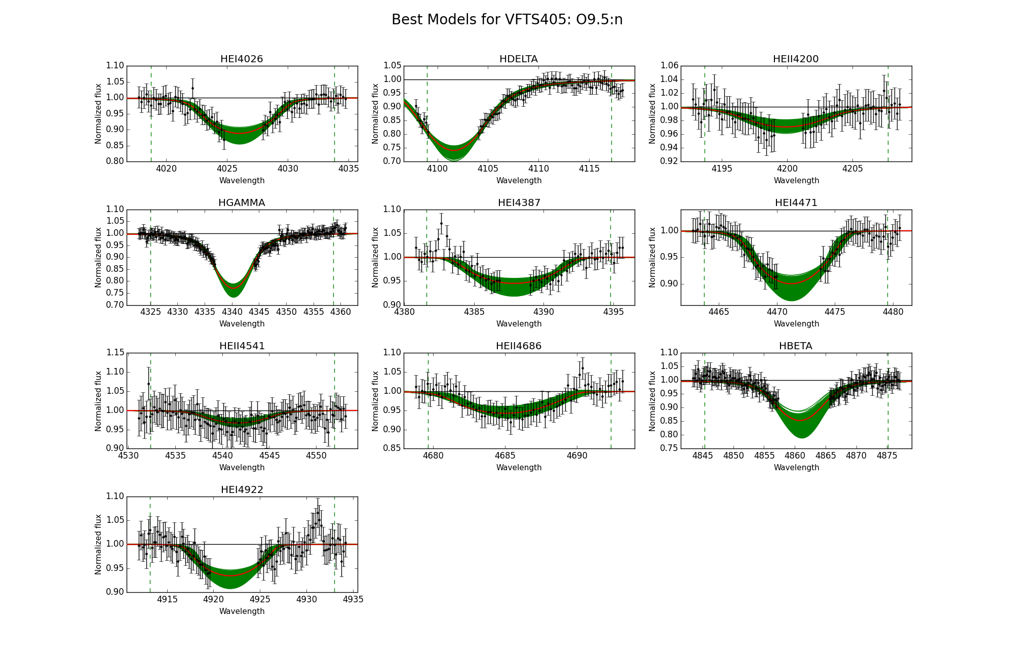 Observed spectra, the 95% probability models (green) and the best fit model (red) for VFTS 400 and 405. The vertical dashed lines indicate the wavelength range used to fit the corresponding diagnostic line.