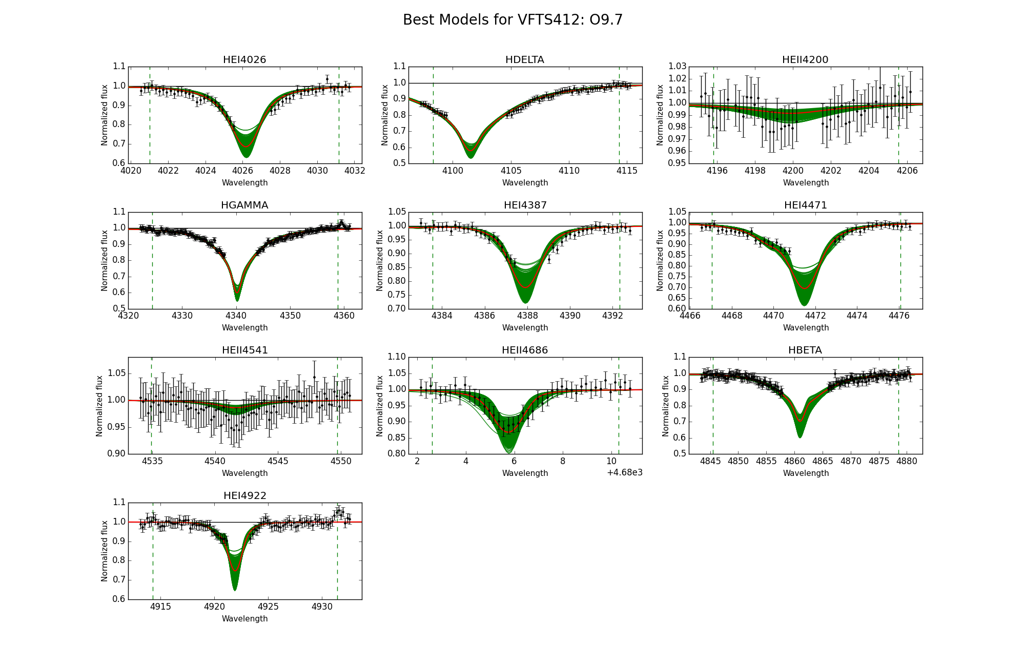 Observed spectra, the 95% probability models (green) and the best fit model (red) for VFTS 412 and 444. The vertical dashed lines indicate the wavelength range used to fit the corresponding diagnostic line.