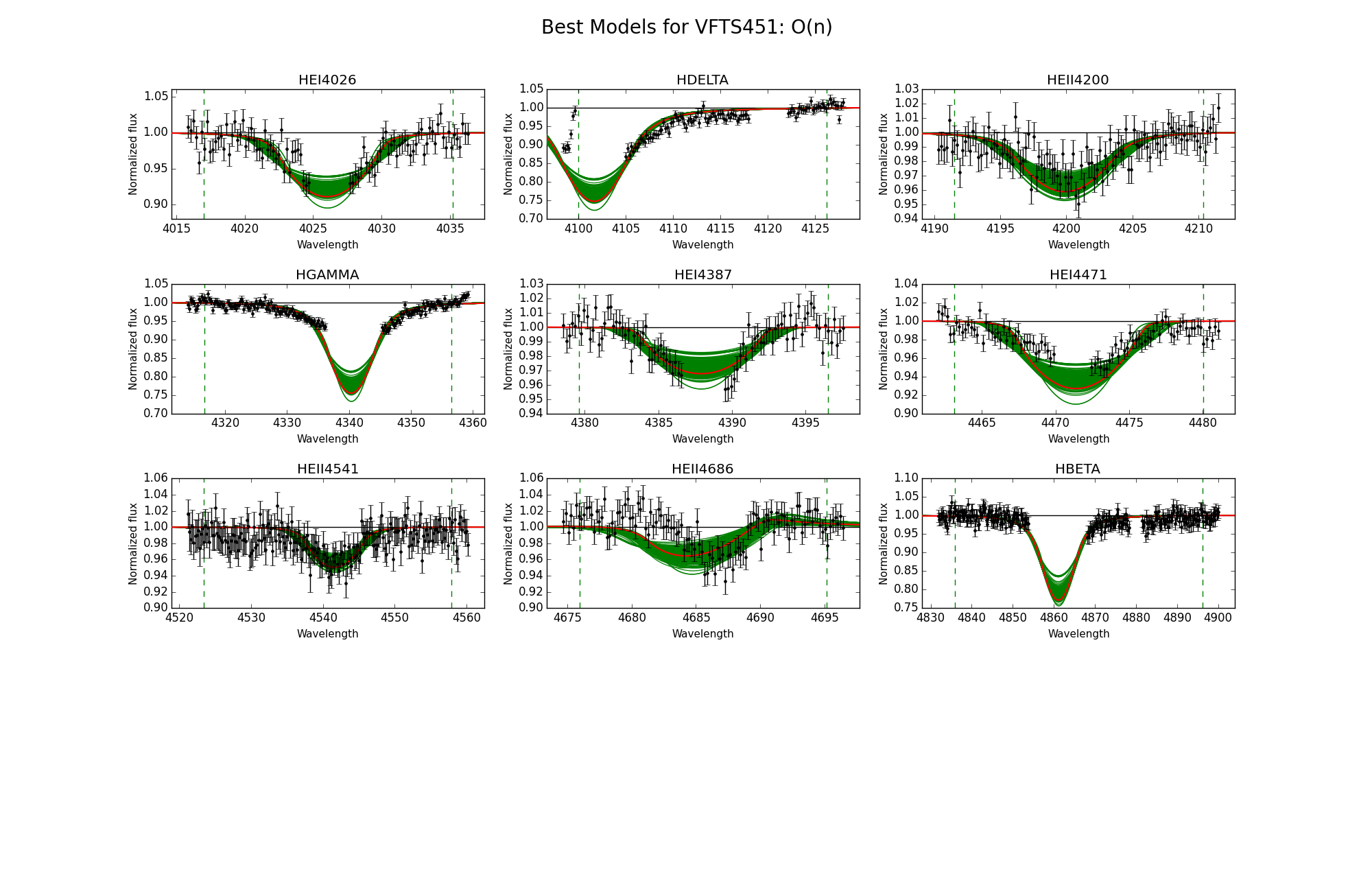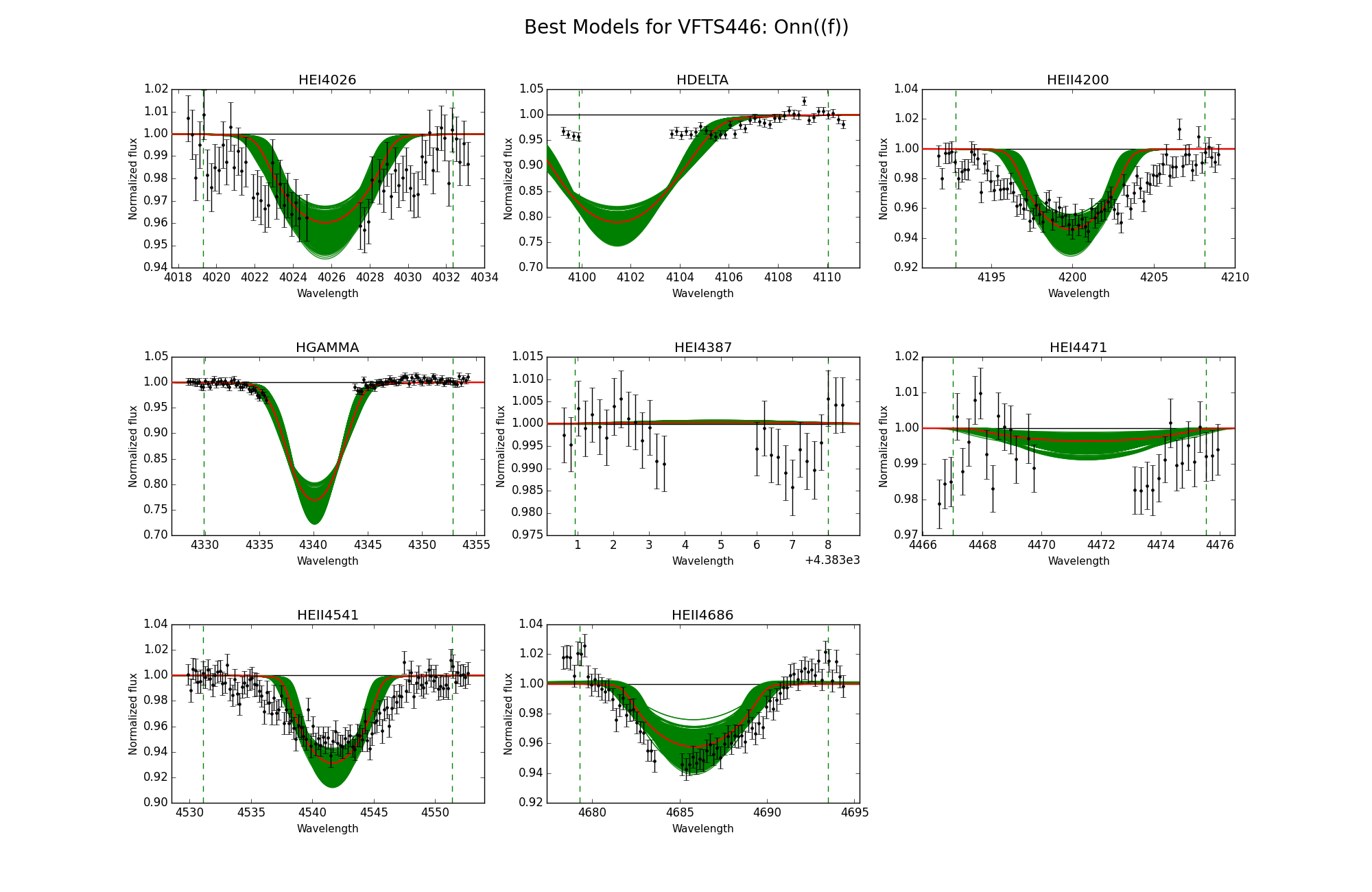 Observed spectra, the 95% probability models (green) and the best fit model (red) for VFTS 446 and 451. The vertical dashed lines indicate the wavelength range used to fit the corresponding diagnostic line.