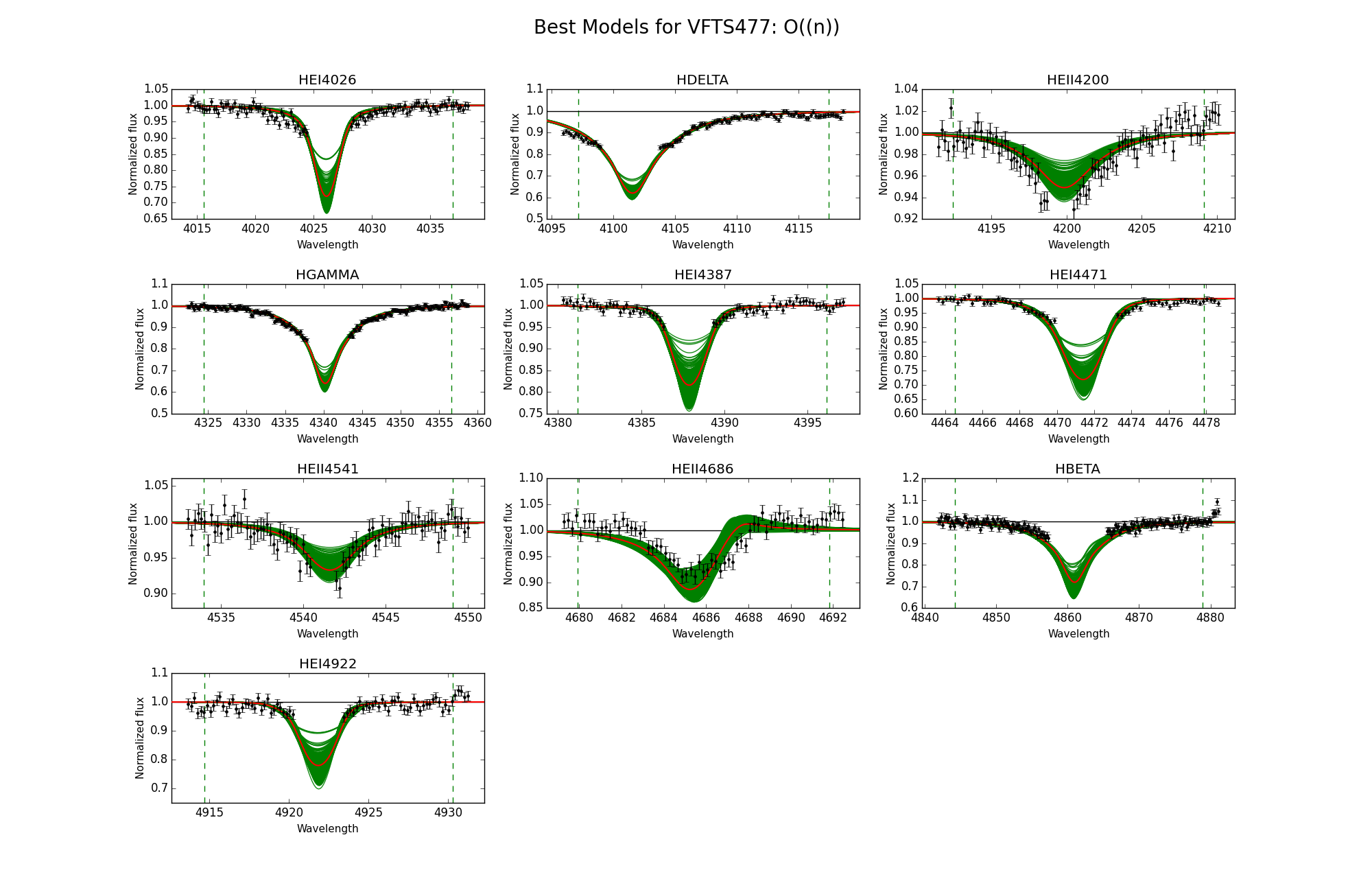 Observed spectra, the 95% probability models (green) and the best fit model (red) for VFTS 476 and 477. The vertical dashed lines indicate the wavelength range used to fit the corresponding diagnostic line.