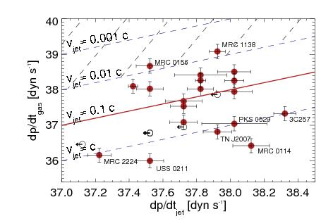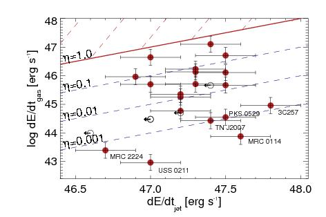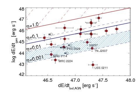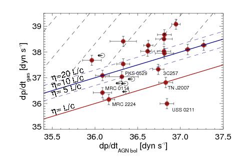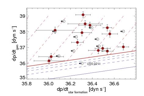 Relationships between the observed kinetic energy (left) and momentum (right) of the gas, for star formation (top), AGN radiation (center) and radio jets (bottom). Filled red and empty black dots show galaxies with FIR detections and upper limits, respectively. Error bars show the measurement uncertainties. Red wide-spaced dashed regions are excluded by energy and momentum conservation, black wide-spaced dashed regions by empirical constraints on the maximum momentum transfer from AGN radiation and radio jet, respectively. In the top right panel, the red and blue solid lines show momentum transfer of 100 and 10% of that provided by star formation, respectively. Heckman et al. (2015) argued that 10% efficiency is most likely. Thin dashed dark blue lines show transfer rates of 30, 50, and 70%. In the middle left panel, the red line shows an energy transfer of 100%, the blue line 5% required by cosmological models, the hatched region of 0.1–1% of Lbol to gas kinetic energy. The latter is favored by observations of FeLoBALs (Moe et al. 2009; Dunn et al. 2010; Bautista et al. 2010) and hydrodynamic models taking radiative transfer explicitly into account (Bieri et al. 2017; Krumholz & Thompson 2012). The same observations and models also favor an average momentum transfer of L/c (red line in the middle right panel), whereas more optimistic models find L/c ~ 10 (dark blue solid line; Zubovas & King 2012; Faucher-Giguère & Quataert 2012). In the bottom left panel, the red solid line represents an energy transfer of 100% from jet to gas, and in the bottom right panel the momentum transfer for the most likely jet expansion velocity of 0.1c. Dashed dark blue lines show the momentum input from the jet for different assumptions of the jet advance speed, assuming that no momentum is lost to other effects. It is therefore not impossible to find galaxies below the line for a jet expansion at the speed of light, c (lowest dark-blue dashed line), due to geometry, gas clumpiness, and other effects.