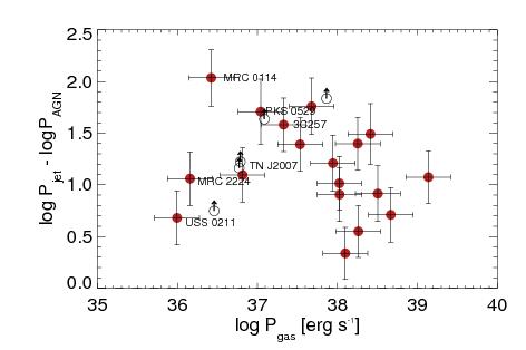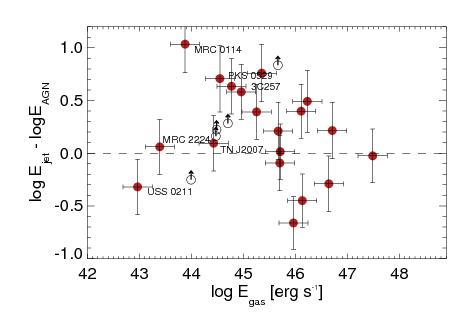 Ratio of the kinetic energy (left) and momentum (right) transferred into the gas through AGN radiation and radio jet as a function of those observed in the gas. The dashed line shows where both are equal. We label individual targets, for which a simple comparison of the energy and momentum input rates do not favor either radiation or jets as the main injection mechanism.
