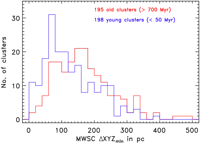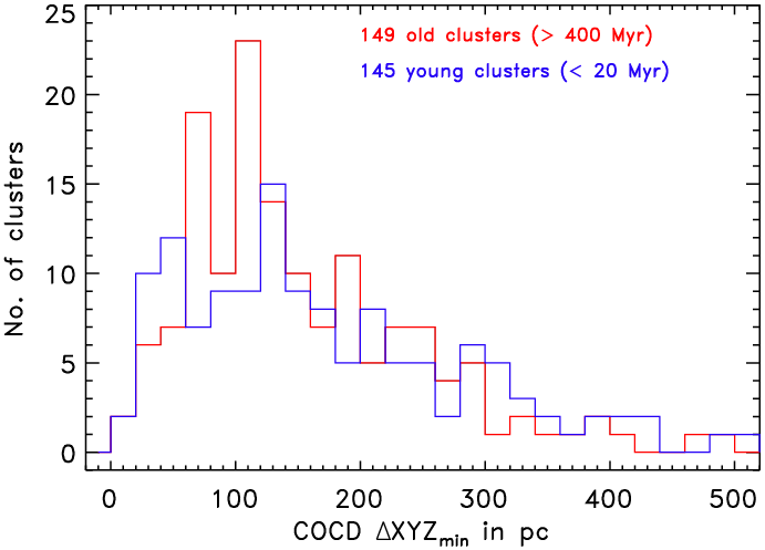 Comparison of the spatial separation histograms of the nearest neighbours in coordinate space between the young (blue) and old (red) Galactic OC population in the entire COCD (upper panel; young <20 Myr, old >400 Myr) and the MWSC within its completeness limit of 1.8 kpc (lower panel; young <50 Myr, old >700 Myr).
