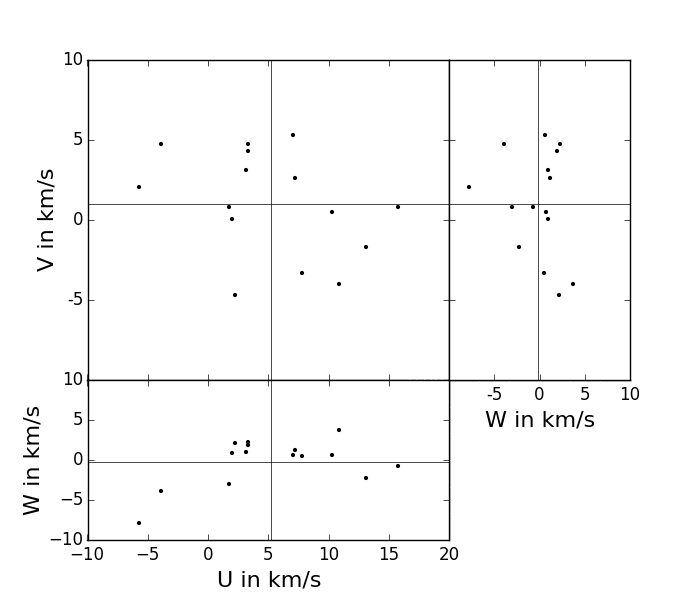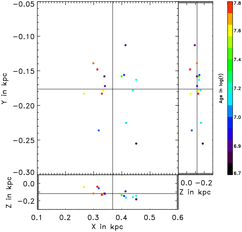 Parameter distributions for the members of the found OC complex. Upper panel: spatial distribution with the age colour coded. Lower panel: velocity distribution. The solid lines show the averaged values for the OC complex.