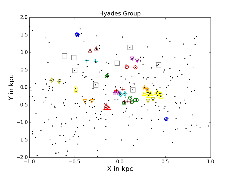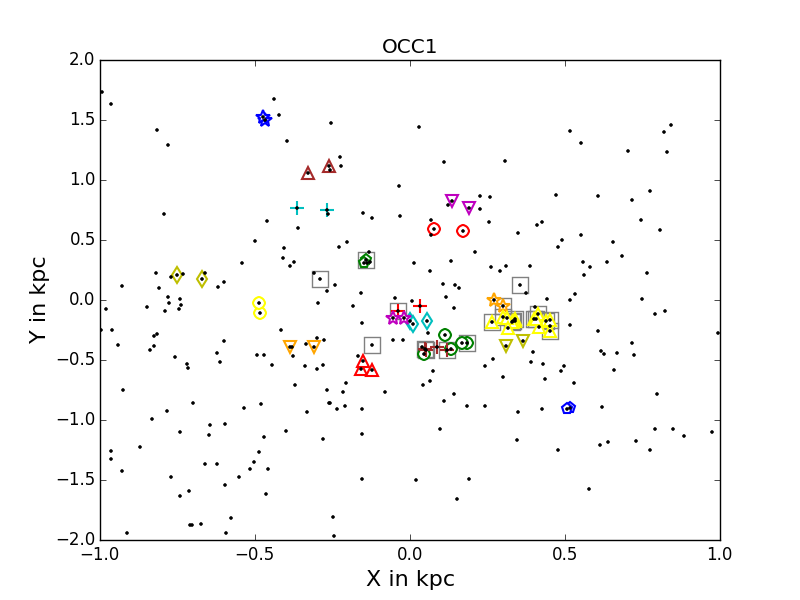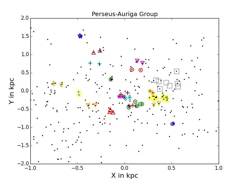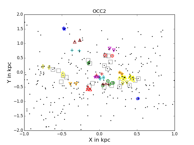 Spatial comparison in the XY-plane of our detected OC groupings, highlighted with the same colours and symbols as in the left panel of Fig. 5, with the groups and complexes proposed by Piskunov et al. (2006). Black dots show COCD clusters with RV data, while grey squares indicate the members of the OCC1 and OCC2 (upper panels), as well as the members of the Perseus-Auriga and Hyades group (lower panels).