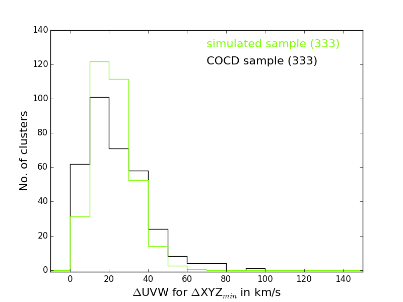 Comparison of the distributions for the spatial separation (upper panel) and velocity difference (lower panel) of the nearest neighbours in XYZ-space. The green histograms are averaged for 1000 realisations of the MCData. The black histograms correspond to the results from our working sample.