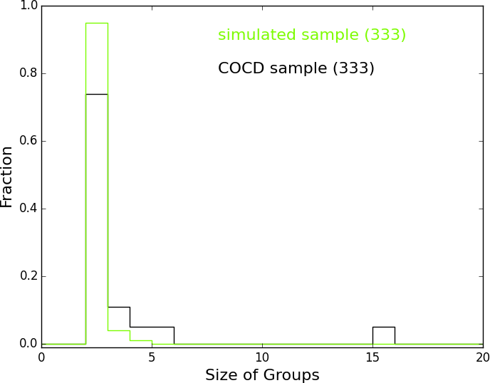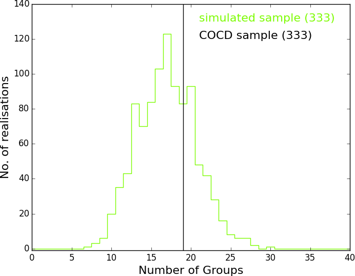 Comparison of the histograms for the number (upper panel) and size (lower panel) of the identified OC groupings for linking lengths of 100 pc and 10 km s-1. The green histograms are averaged for 1000 realisations of the MCData. The black histograms correspond to the results from our working sample.
