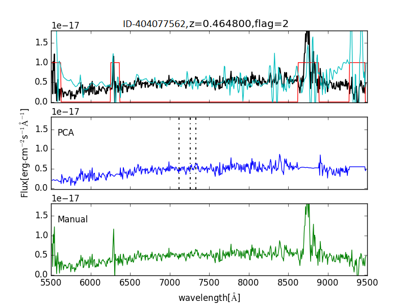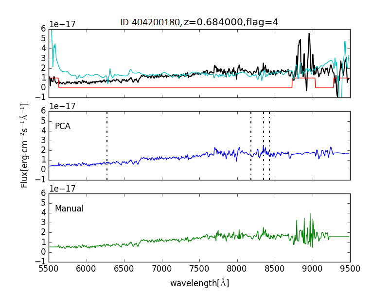 Cleaning of a Flag 4 (top) and a Flag2 (bottom) VIPERS spectrum. For each panel: the upper plot is the observed (sky subtracted) spectrum (thick black), superposed to the mask (straight red lines) and the rescaled sky residuals spectrum (thin cyan); the middle plot shows the automatic cleaning, with the expected position of the [OII], Hβ and [OIII] lines marked in black by the dash-dotted lines; and the bottom plot is the manually edited spectrum.