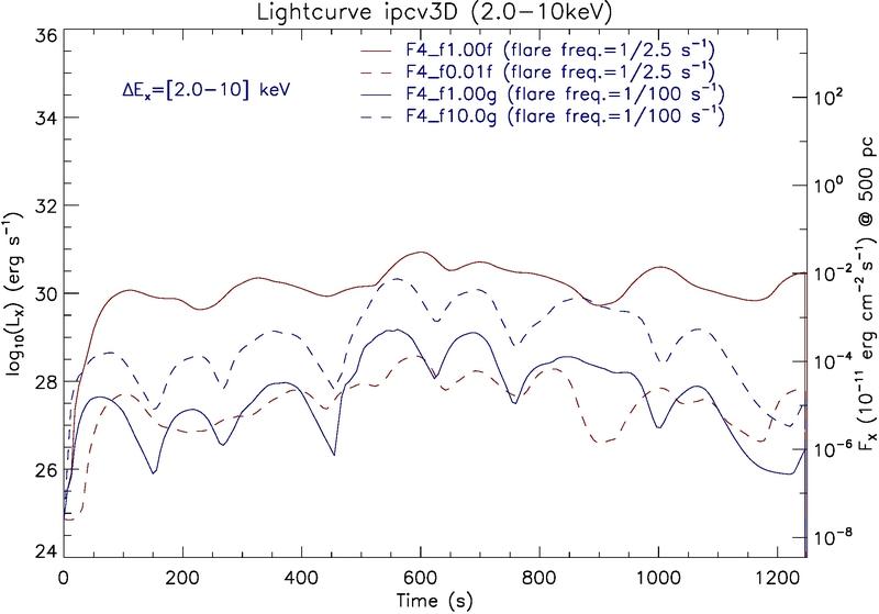 Comparative plot of lightcurves relative to the reference model. The explored parameters are the frequency and the intensity of the energy pulse (flares). On the left panel, soft X-ray band [ 0.1−2.0 ]keV lightcurves; on the right panel, hard X-ray band [ 2.0−10 ]keV lightcurves.