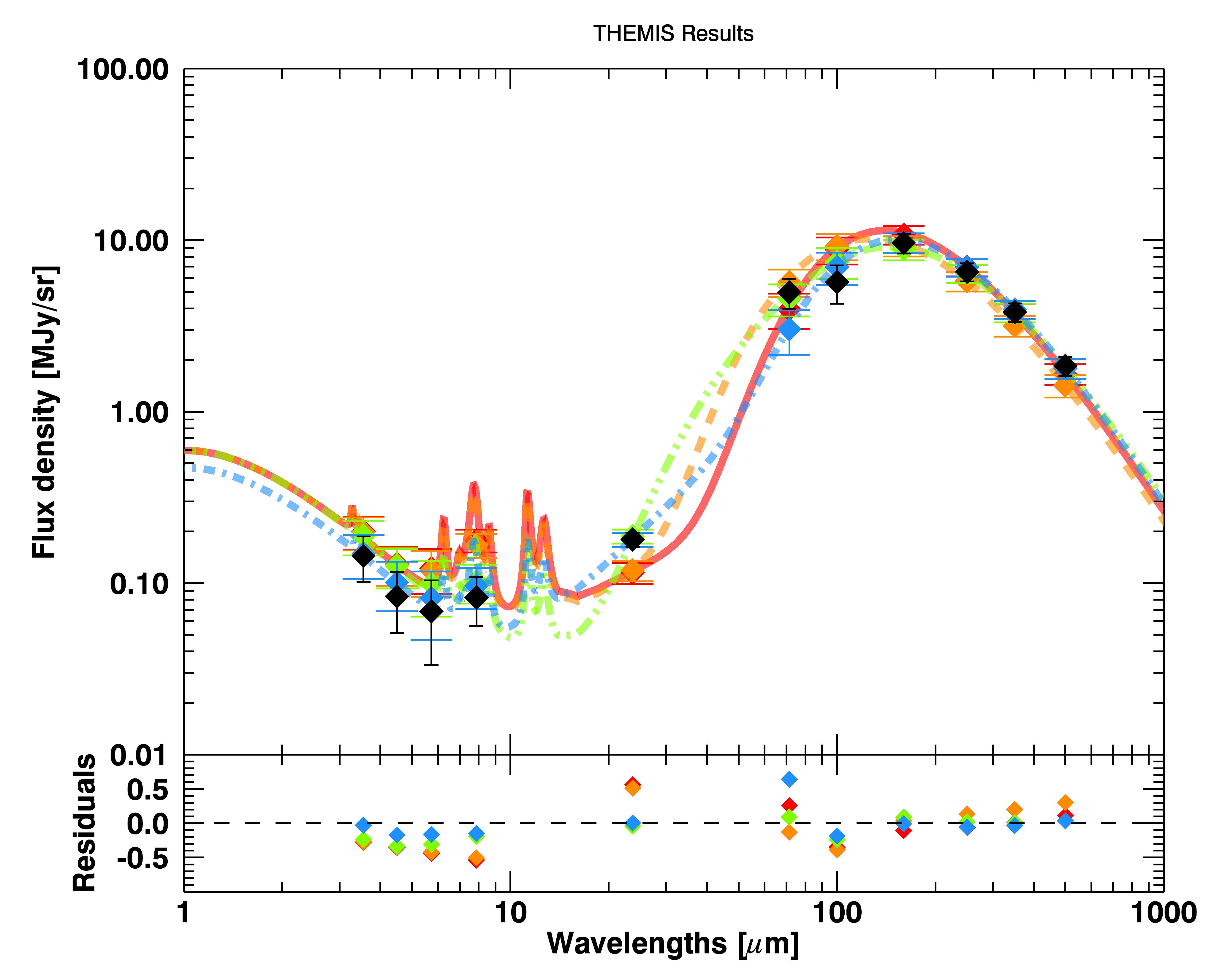 Examples of the fit results in the SMC for faint (left) and bright (right) pixels. We note the difference in the residuals (namely in the FIR) best fit in faint (diffuse) environments. We also see the impact of a change in the 8/24 μm slope on the fits in the MIR.