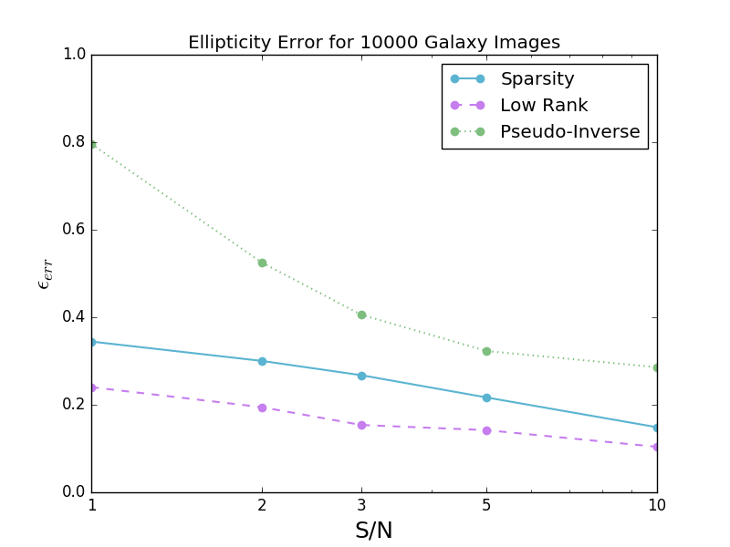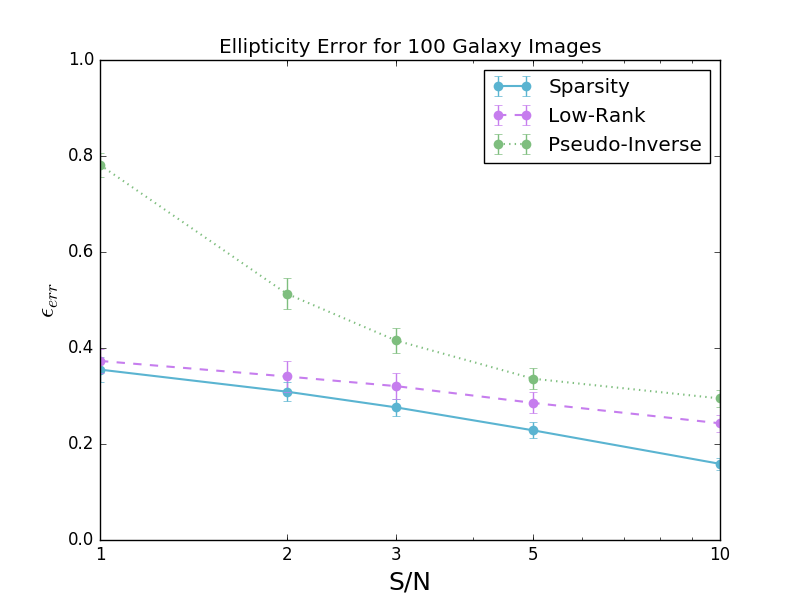 Ellipticity error as a function of S/N. Mean results from ten random samples of 100 galaxy images with standard deviation error bars (top-left panel). Mean results from ten random samples of 1000 galaxy images with standard deviation error bars (top-right panel). Results for all 10 000 galaxy images (bottom). Solid blue lines indicate results obtained using sparse regularisation, dashed purple lines indicate results obtained using the low-rank approximation and dotted green lines indicate results obtained using a pseudo-inverse deconvolution.