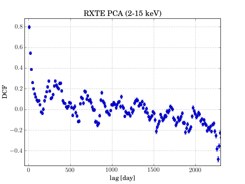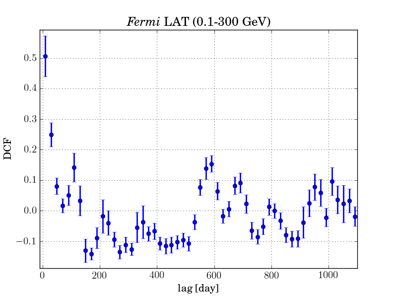 Auto-correlation function(DCF) of the X-ray(RXTE PCA, 2–15 keV, left) and gamma-ray(Fermi-LAT, 0.1–300 GeV, right) light curves.DCF time bins of 13 and 20 days are adopted, respectively. The reported errors are the statistical 1σ uncertainties.