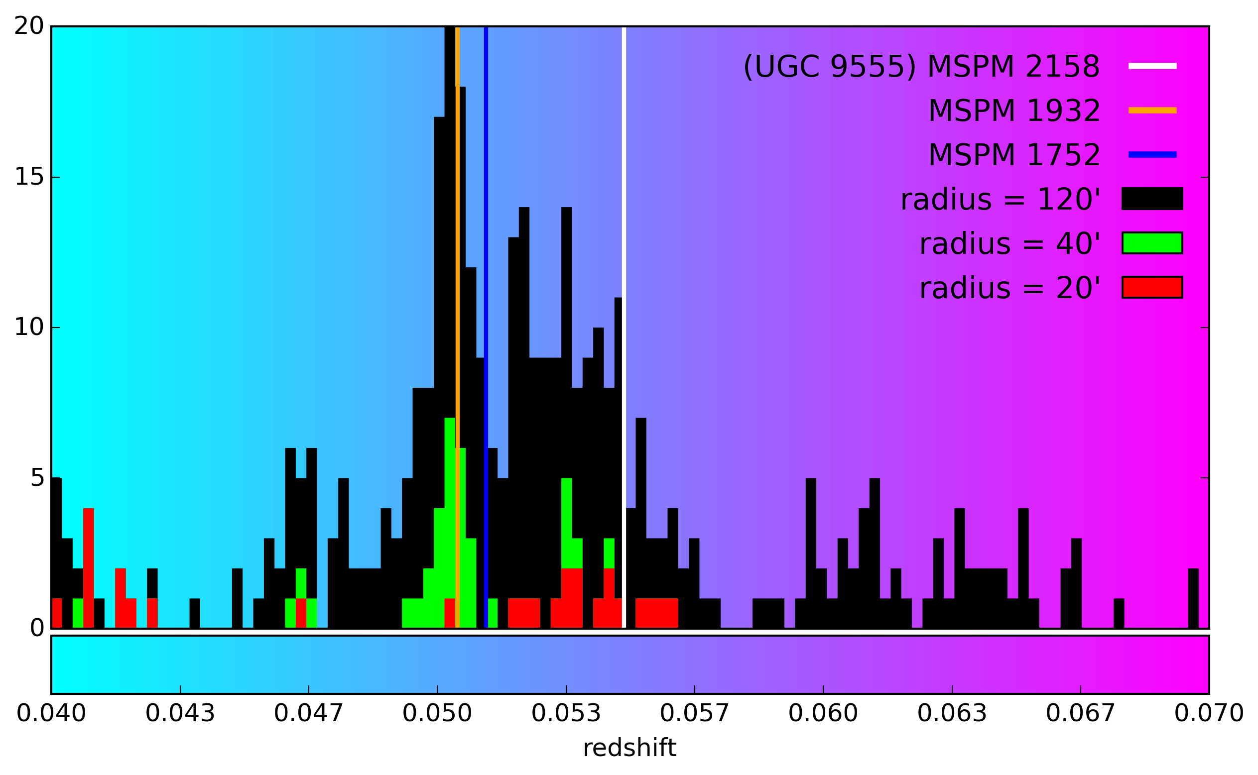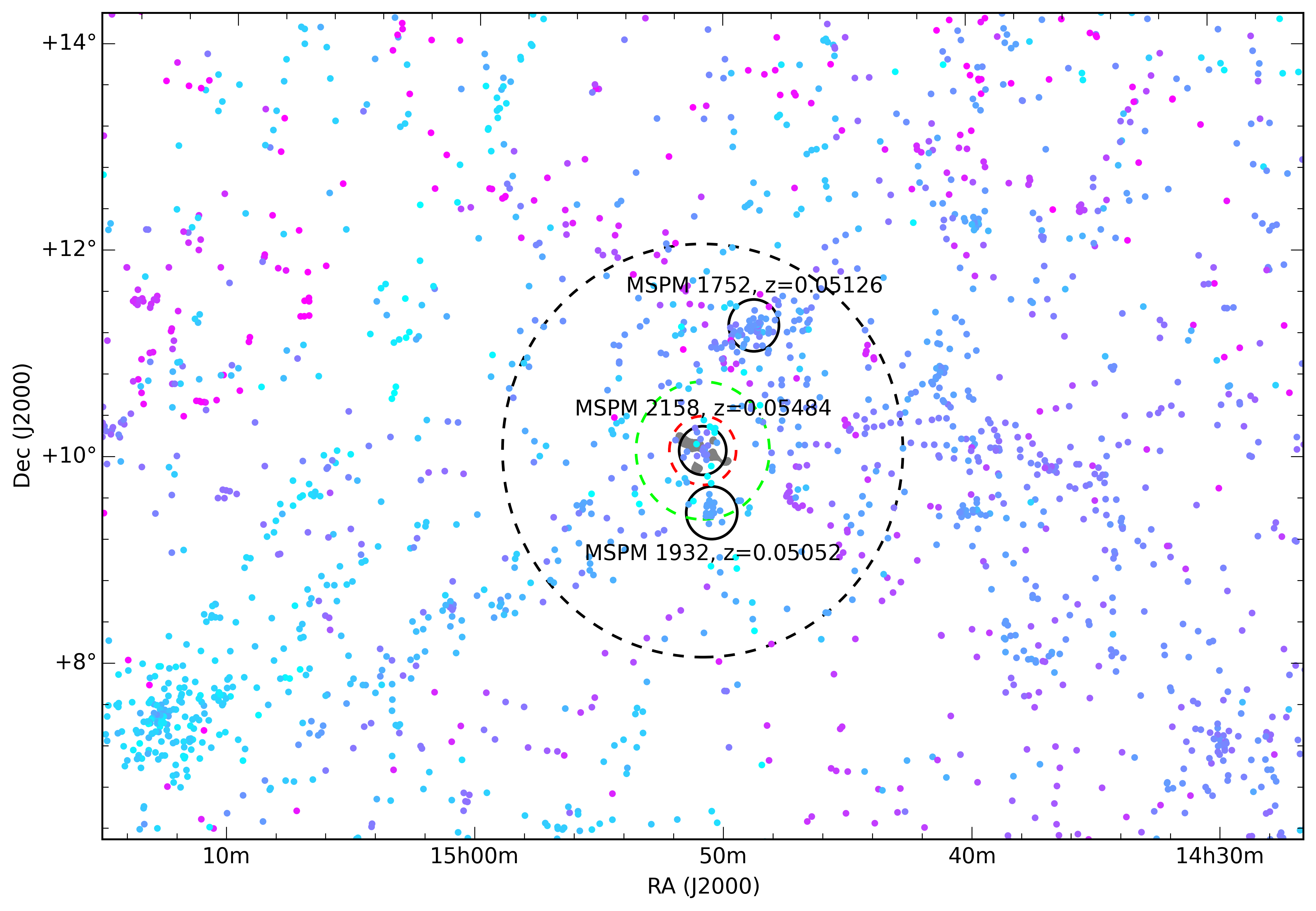 Top: large-scale galaxy distribution is shown, where filled circles coloured by redshift are galaxies identified with spectroscopic redshifts in SDSS DR12. Black circles of 1 Mpc radius (at their respective redshifts) are centred on the closest three galaxy groups in the region identified by multiscale probability mapping analysis. The grey-shaded area in MSPM 2158 shows the extent of the GRG. For a detailed view of the inner region around the GRG, see Fig. 1. Dashed circles in black, green and red are overlaid to show the areas included in the histogram to theleft. Left: a histogram of the redshifts of galaxies in SDSS Data Release 12 within several radii around the host AGN, as illustrated in the top panel.