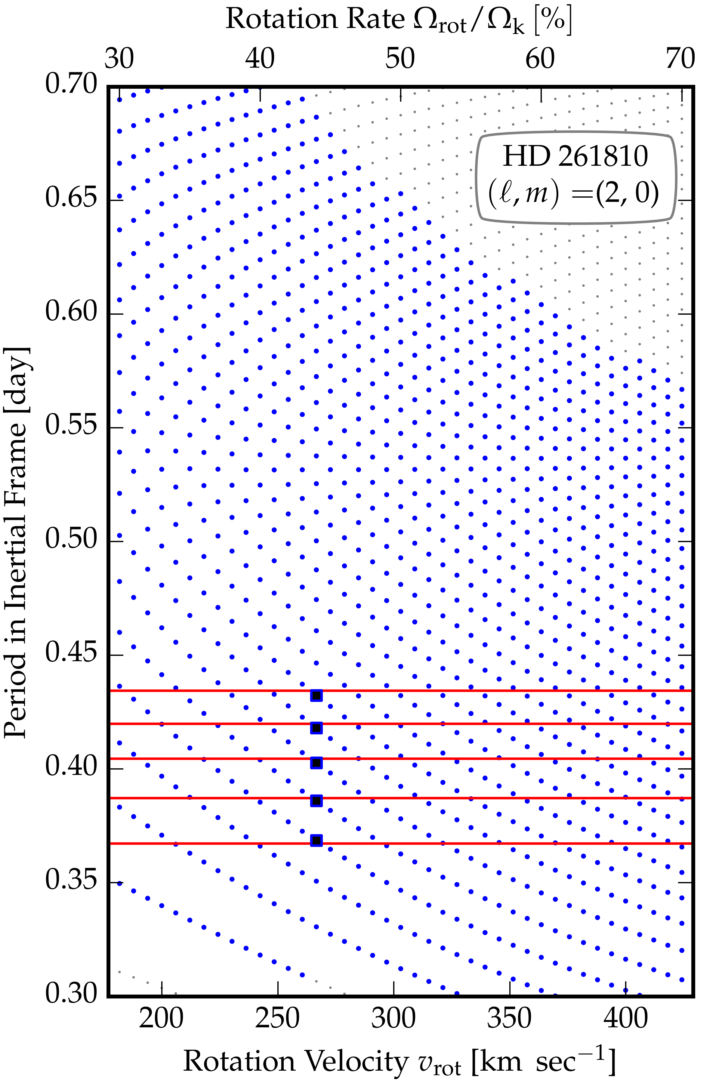 Evolution of mode periods in the inertial frame versus equatorial rotation velocity. The observed periods of HD 261810 are shown with horizontal red lines. The stable modes are shown with gray dots, while the excited modes are shown with blue dots. Left: the dipole prograde modes provide a possible period match for vrot = 235 km s-1. Right: the quadrupole zonal modes can equally provide a fit for vrot = 270 km s-1. Table 14 summarizes the results for different ℓ and m.