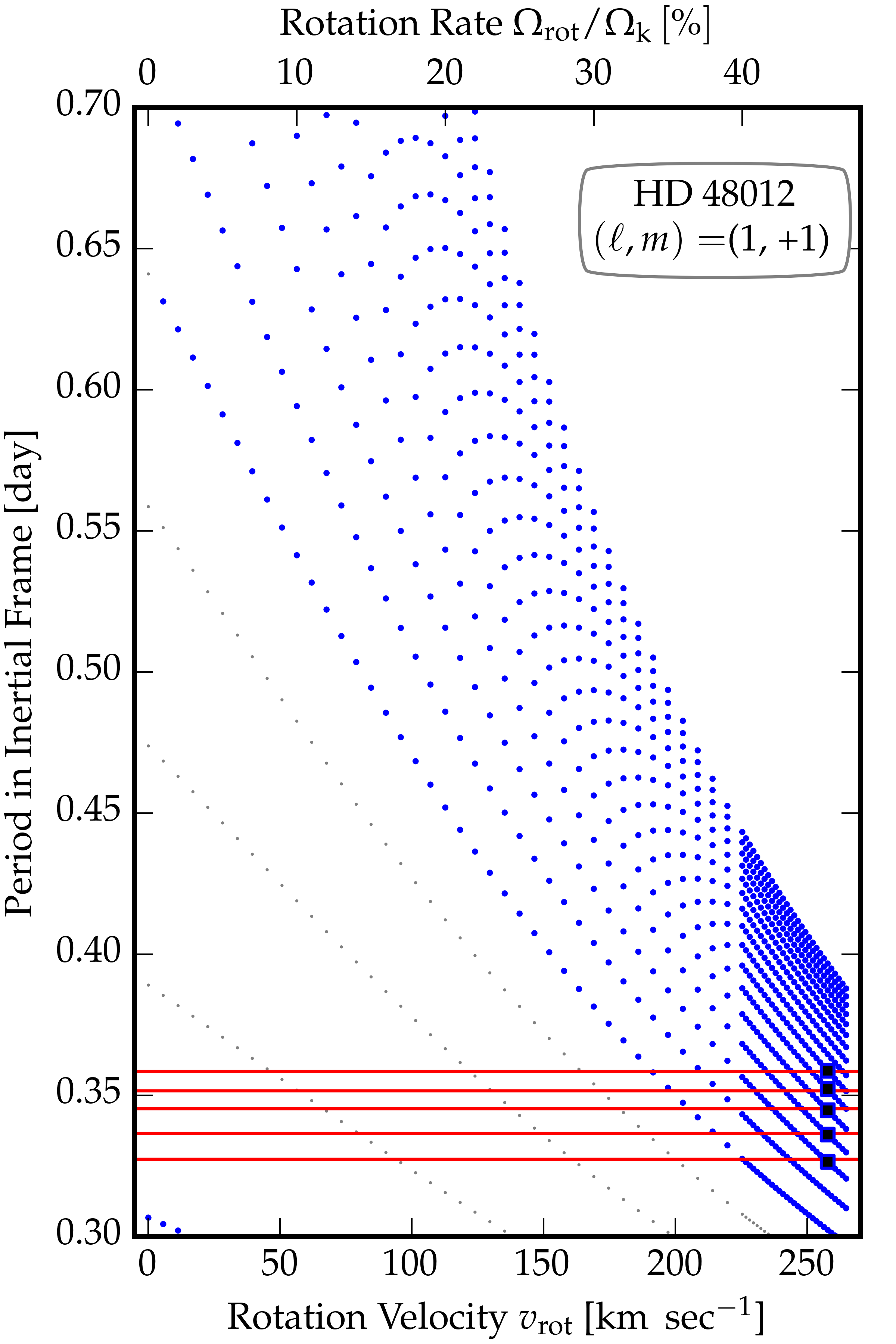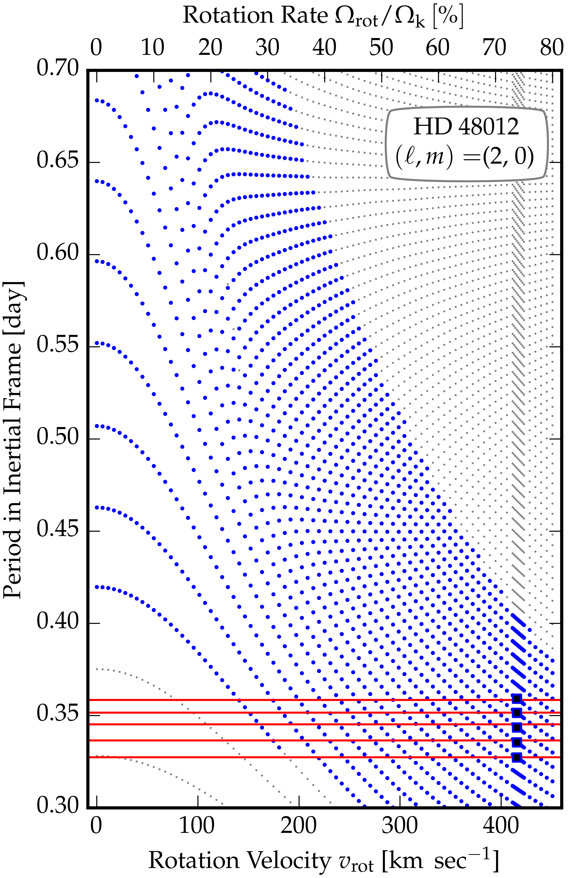 As in Fig. 19 but for HD 48012. Note that the projected rotation velocity is vsini = 220 ± 20 km s-1. The (ℓ,m) = (2, 0) is rejected because it requires high rotation velocities, giving rise to B[e] phenomenon, which is not observed in spectroscopy.