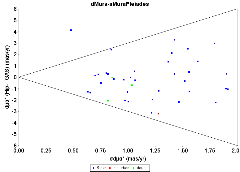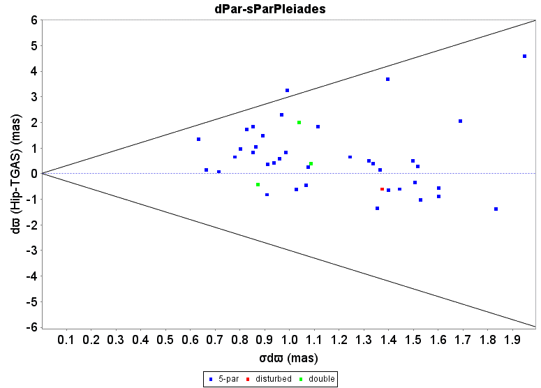 Differences in parallax (top) and proper motion in Right Ascension (bottom) between the Hipparcos and TGAS solutions, for members of the Pleiades cluster, and as a function of the errors on the differences.
