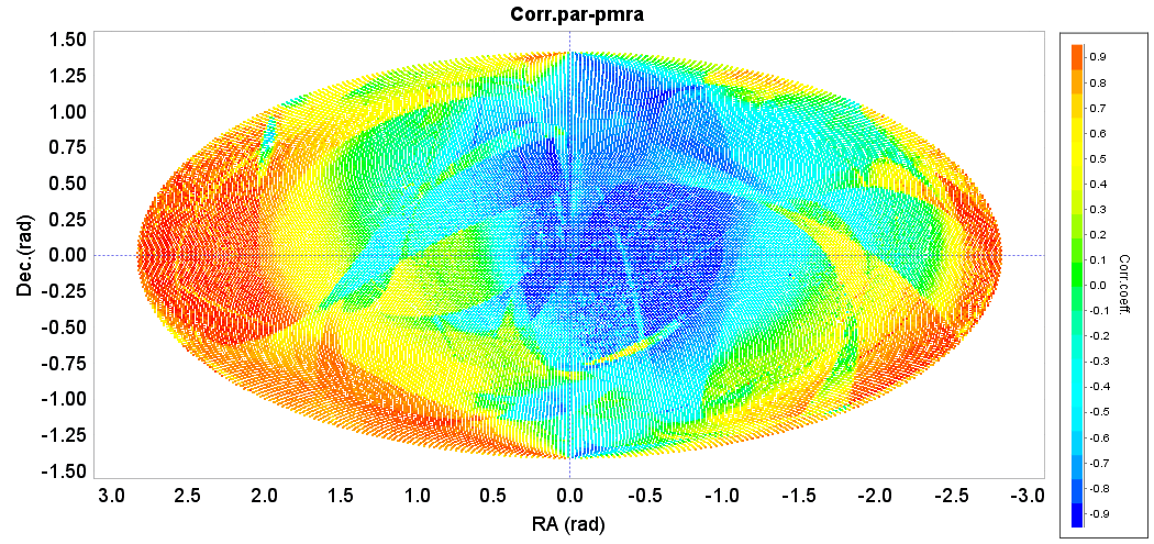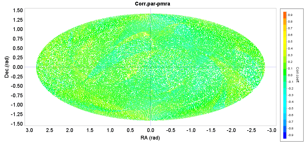 Correlation coefficients between the proper motion in Right Ascension and the parallax, averaged over HEALPix level 5 pixels. Top: for stars with first-epoch Hipparcos positions; bottom: for stars with first-epoch Tycho-2 positions. Correlations in the bottom graph are clearly systematic over the sky (linked to scan coverage) and can reach values over ±0.9. Similar correlations, but differently distributed, are observed between all the astrometric parameters for data with first epoch Tycho-2 positions.