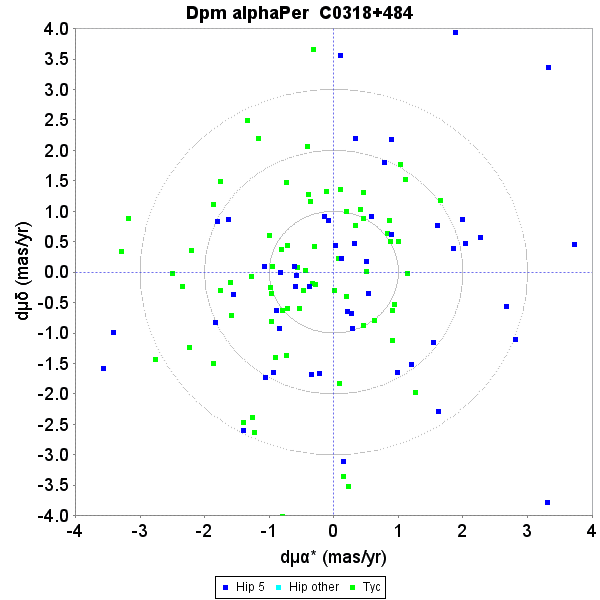 Proper motion charts for the α Per cluster. Top: unit weight residual proper motions. Green dots have first epoch Tycho-2 data, the dark blue dots have Hipparcos first epoch 5-parameter solutions. The concentric circles represent 1–3σsu levels. Bottom: actual proper motion distribution, where the colour indicate the difference from the cluster parallax in su units.