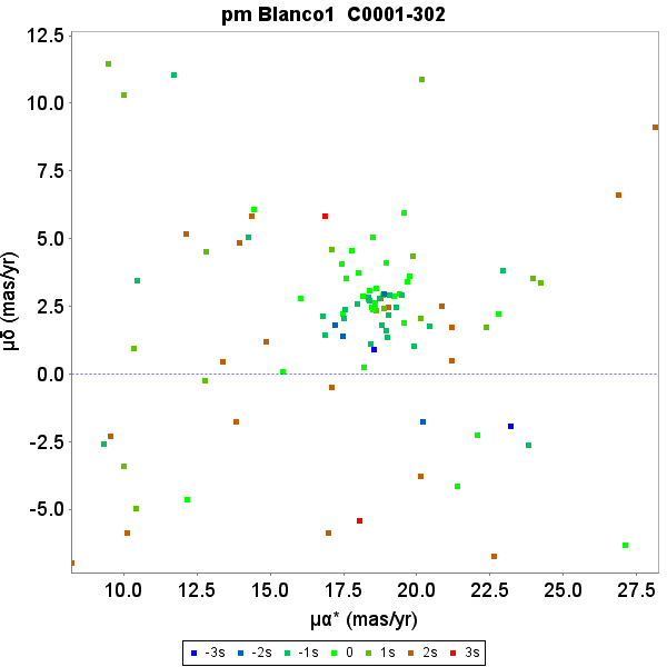 Proper motion charts for the cluster Blanco 1. Top: unit weight residual proper motions. Green dots have first epoch Tycho-2 data, the dark blue dots have Hipparcos first epoch 5-parameter solutions. The concentric circles represent 1–3σsu levels. Bottom: actual proper motion distribution, where the colour indicate the difference from the cluster parallax in su units.