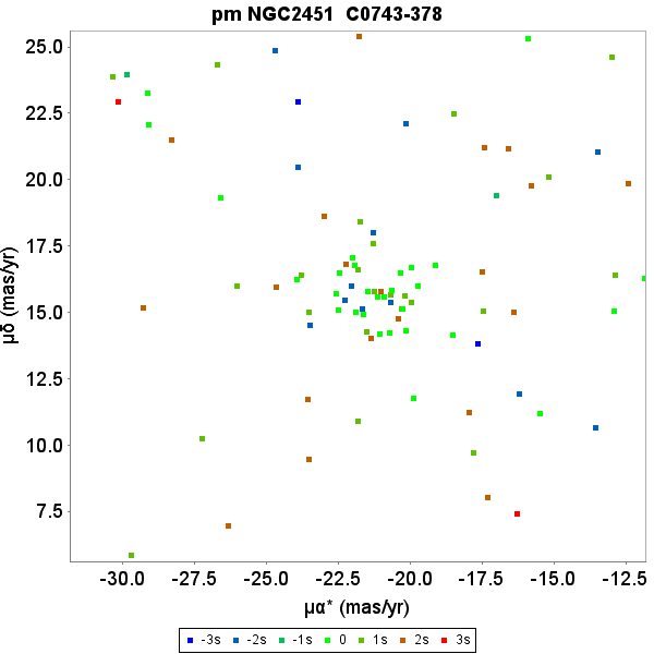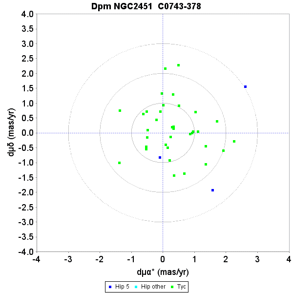 Proper motion charts for the cluster NGC 2451. Top: unit weight residual proper motions. Green dots have first epoch Tycho-2 data, the dark blue dots have Hipparcos first epoch 5-parameter solutions. The concentric circles represent 1–3σsu levels. Bottom: actual proper motion distribution, where the colour indicate the difference from the cluster parallax in su units.