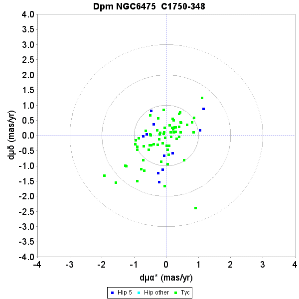Proper motion charts for the cluster NGC 6475. Top: unit weight residual proper motions. Green dots have first epoch Tycho-2 data, the dark blue dots have Hipparcos first epoch 5-parameter solutions. The concentric circles represent 1–3σsu levels. Bottom: actual proper motion distribution, where the colour indicate the difference from the cluster parallax in su units.