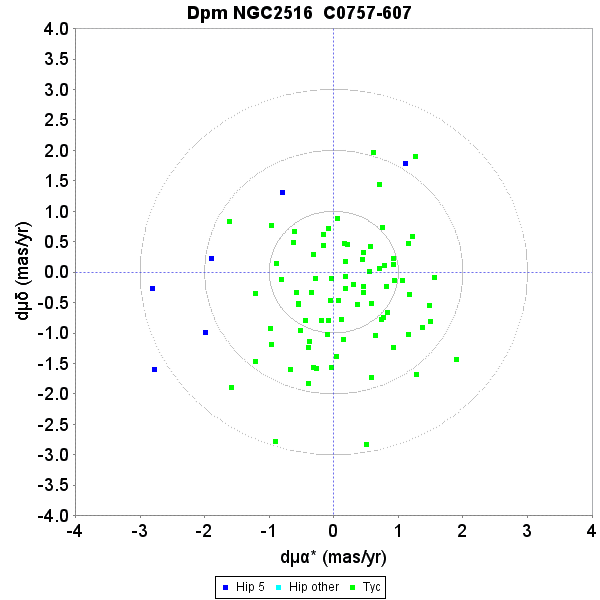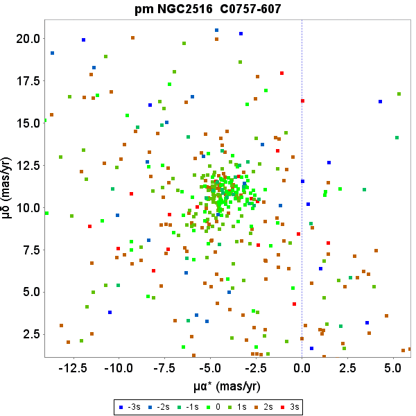 Proper motion charts for the cluster NGC 2516. Top: unit weight residual proper motions. Green dots have first epoch Tycho-2 data, the dark blue dots have Hipparcos first epoch 5-parameter solutions. The concentric circles represent 1–3σsu levels. Bottom: actual proper motion distribution, where the colour indicate the difference from the cluster parallax in su units.