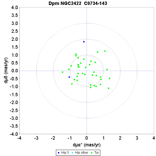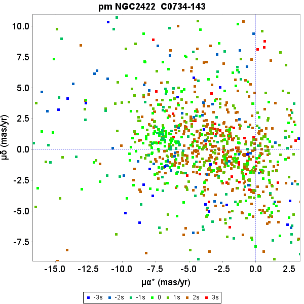 Proper motion charts for the cluster NGC 2422. Top: unit weight residual proper motions. Green dots have first epoch Tycho-2 data, the dark blue dots have Hipparcos first epoch 5-parameter solutions. The concentric circles represent 1–3σsu levels. Bottom: actual proper motion distribution, where the colour indicate the difference from the cluster parallax in su units.