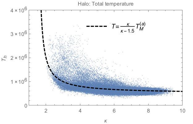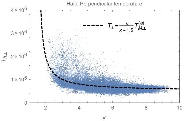 Scatter plots (blue dots) of the halo temperature T [K] vs. κ-index, measured in the ecliptic (0.3 <R< 4 AU): total temperature (top), and the components, parallel (middle) and perpendicular temperature (bottom). The temperatures predicted by the Eqs. (15)–(17) as functions of κ parameter are overplotted with dashed lines.