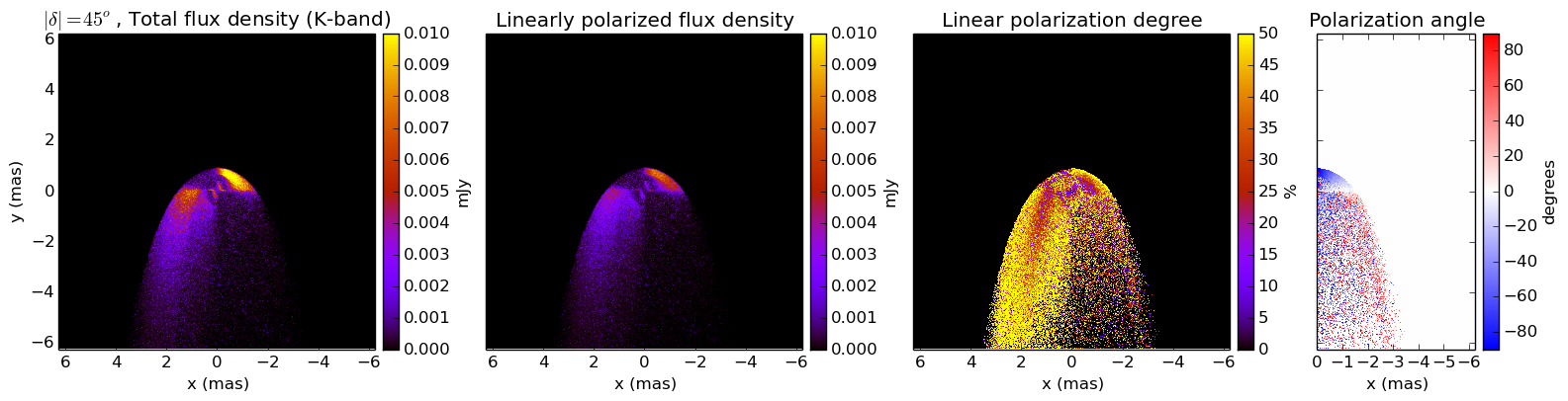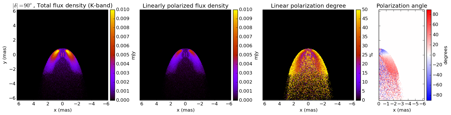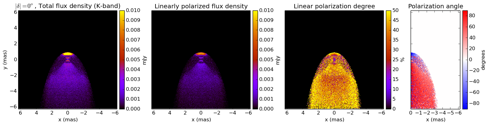 Simulated images of the total flux density in Ks band (first panels from the left side), linearly polarized flux density (second panels from the left side), the distribution of the polarization degree (second panels from the right side), and the distribution of the polarization angle (first panels from the right side) for the different position angle of the bipolar outflow; δ = 0°, 45°, and 90°from the top to the bottom panels.