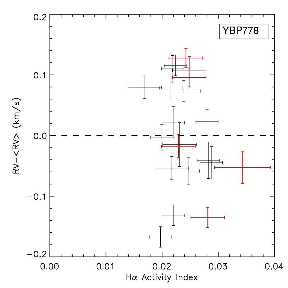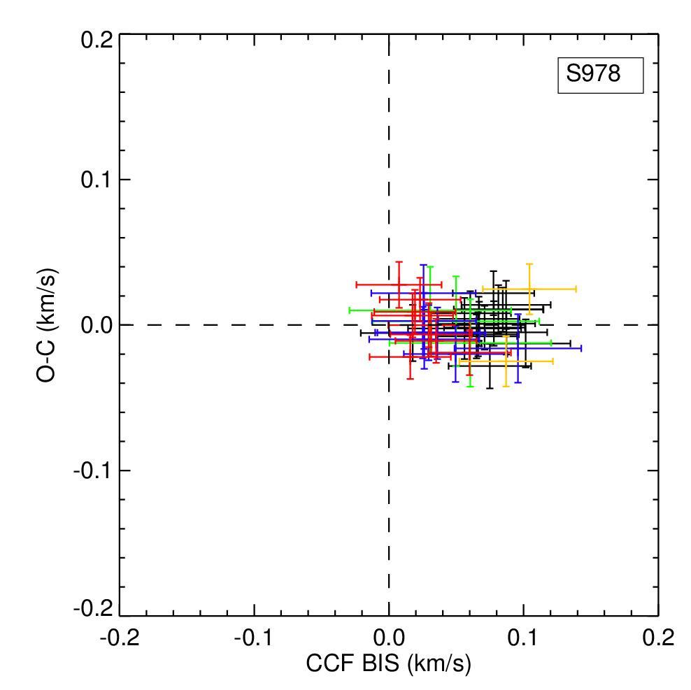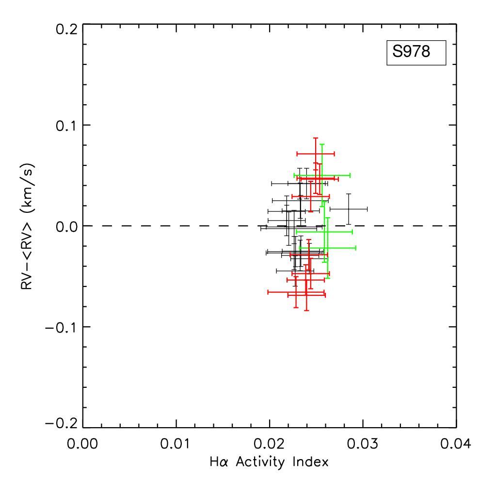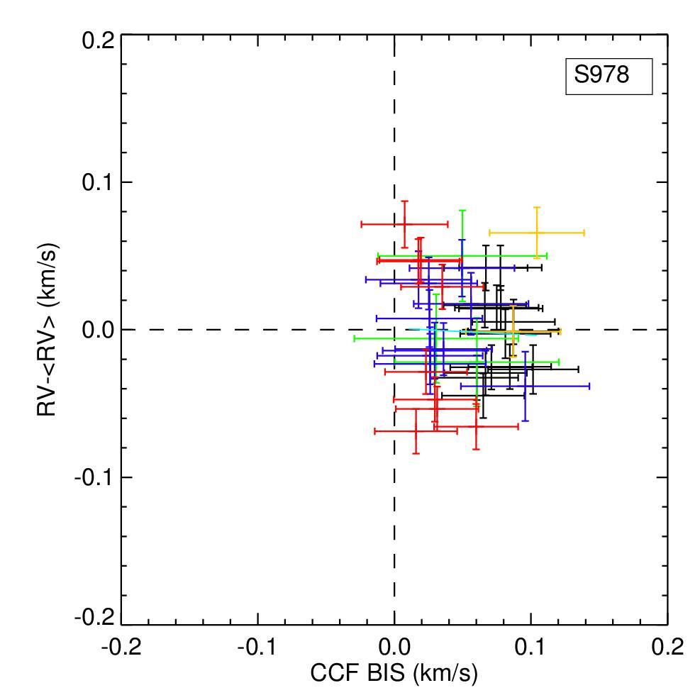 Top: RV measurements versus bisector span, residuals versus bisector span, RV measurements versus CCF FWHM, and RV measurements versus Hα activity indicator for YBP778. The Hα activity indicator is computed as the area below the core of Hα line with respect to the continuum. CCF FWHM values are calculated by subtracting in quadrature the respective instrumental FWHM. The same symbols as in Fig. 4. Bottom: same plots for S978.