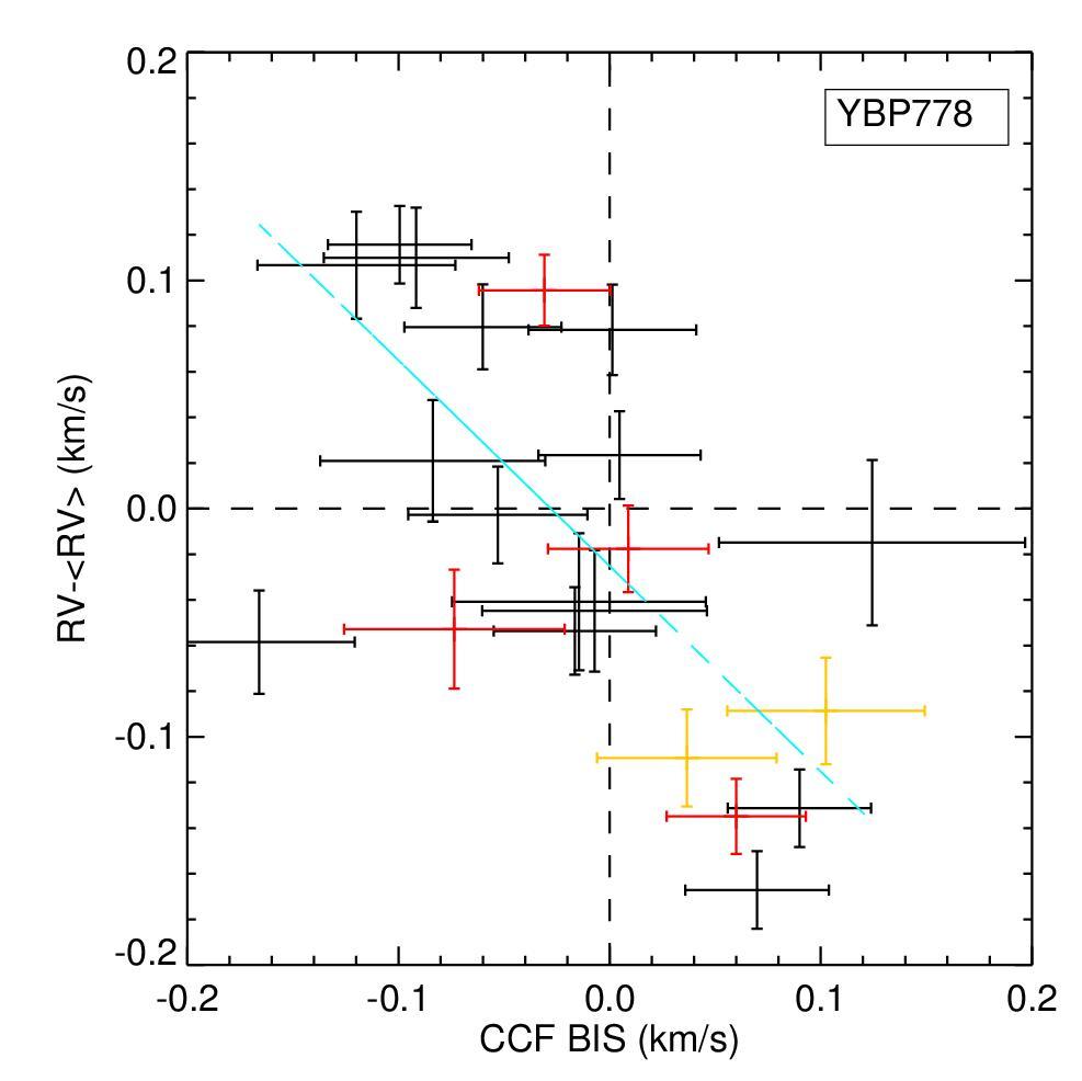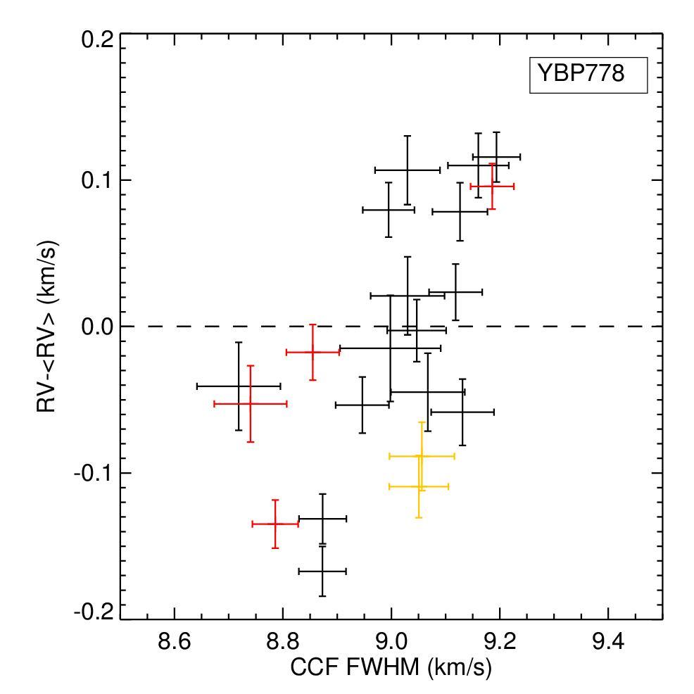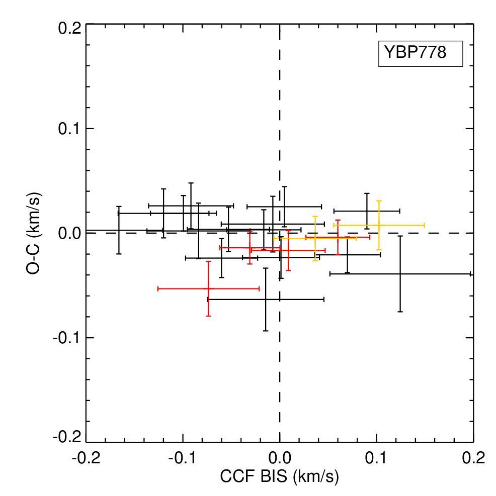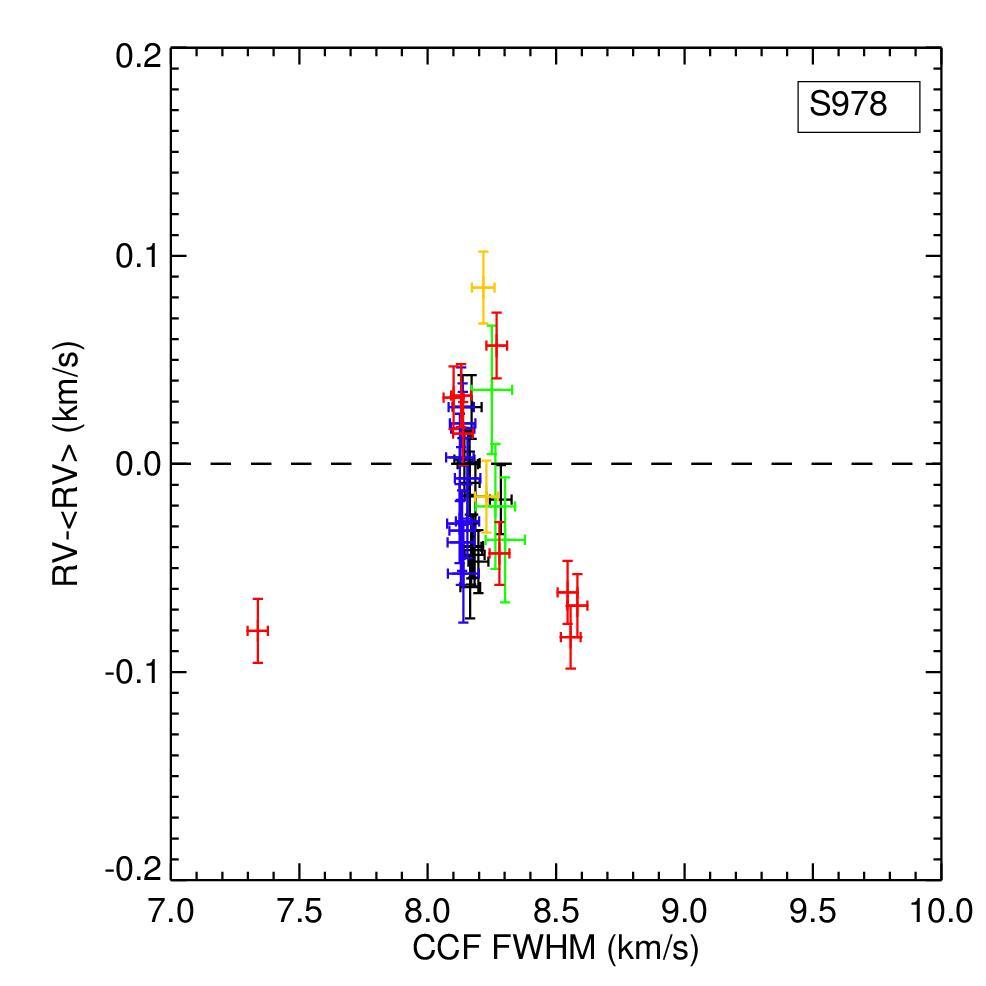 Top: RV measurements versus bisector span, residuals versus bisector span, RV measurements versus CCF FWHM, and RV measurements versus Hα activity indicator for YBP778. The Hα activity indicator is computed as the area below the core of Hα line with respect to the continuum. CCF FWHM values are calculated by subtracting in quadrature the respective instrumental FWHM. The same symbols as in Fig. 4. Bottom: same plots for S978.