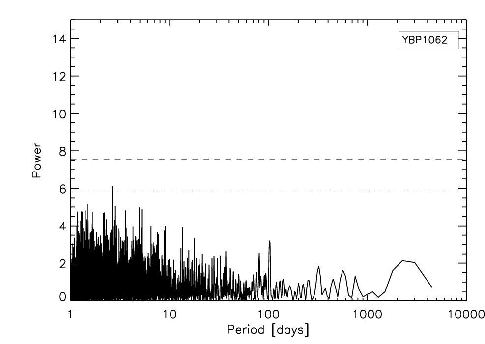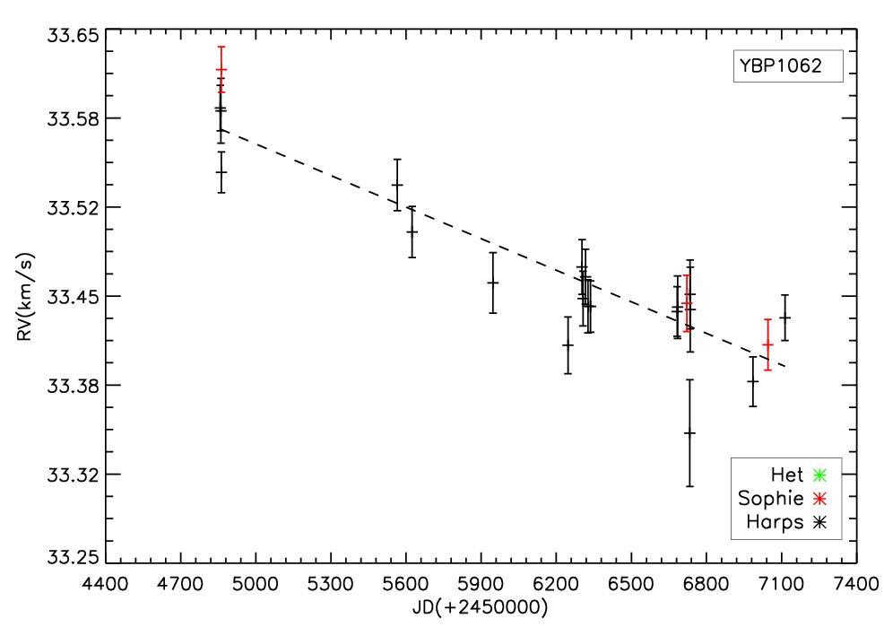 Left: RV time series with the fitted linear trend of YBP1062 overlaid. Right: periodogram of the residuals after the RV trend has been removed. Same symbols as in Fig. 3.